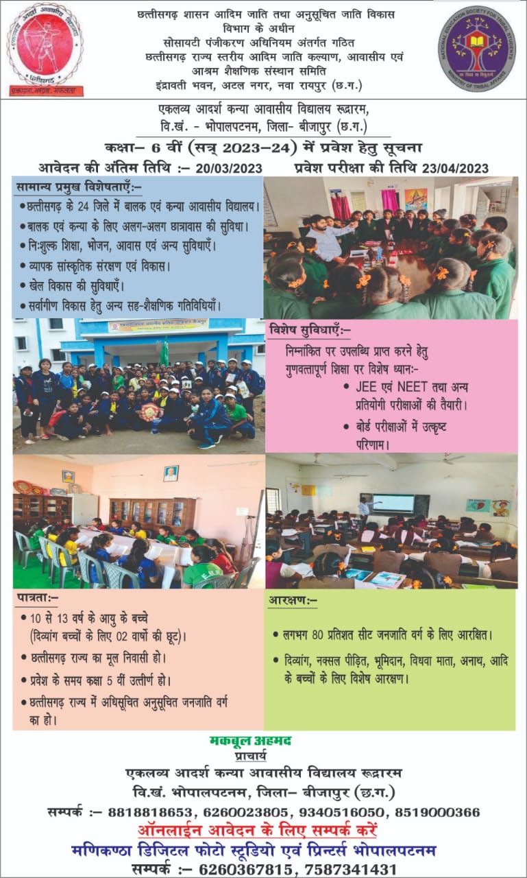 भोपालपटनम :- छत्तीसगढ़ राज्य स्तरीय आदिम जाति कल्याण आवासीय एवं आश्रम शैक्षणिक संस्थान समिति इंद्रावती भवन अटल नगर नया रायपुर छत्तीसगढ़ से प्राप्त निर्देश अनुसार एकलव्य आदर्श कन्या आवासीय विद्यालय रूद्राराम विकासखंड भोपालपटनम जिला बीजापुर छत्तीसगढ़ में कलेक्टर के निर्देशानुसार एवं सहायक आयुक्त के मार्गदर्शन में ऑनलाइन आवेदन प्रारंभ हो चुका है।