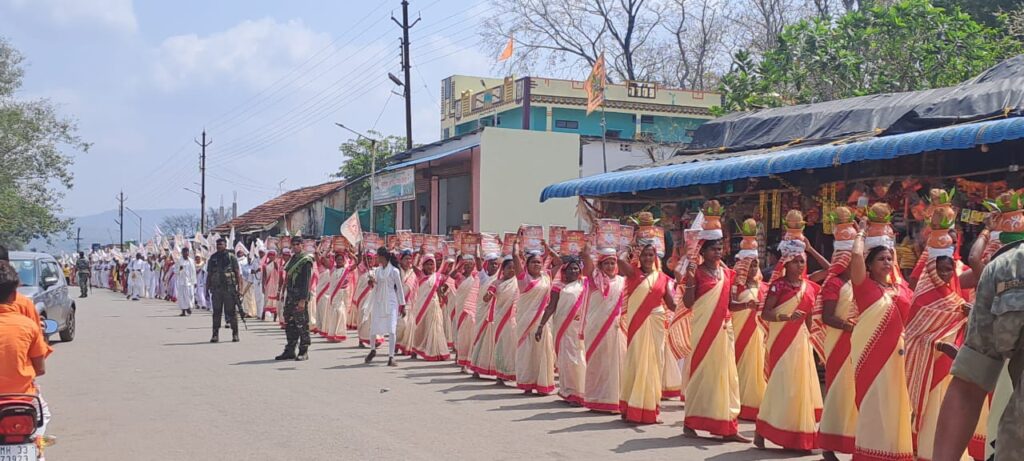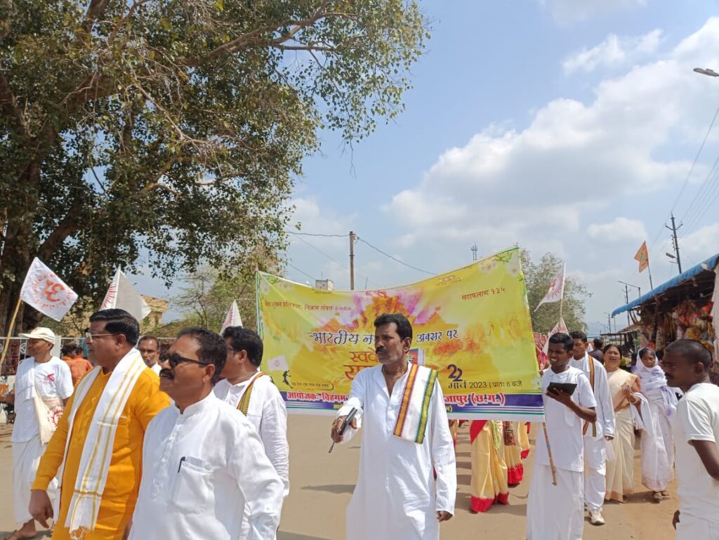 भोपालपटनम :- प्रति वर्ष की भांति इस वर्ष भी चैत्र प्रतिपदा हिंदू नव वर्ष एवं चैत्र नवरात्रि के पावन अवसर के उपलक्ष में इस वर्ष भोपालपटनम नगर में विशाल स्वर्वेद यात्रा एवं कलश यात्रा निकाली गई ।विहंगम योग संत समाज जिला बीजापुर के तत्वाधान में भोपालपटनम के हृदय स्थल श्री कृष्णा पामभोई क्लब प्रांगण से हाई स्कूल चौक से मुख्य मार्ग होते हुए योग शिक्षा ज्ञान एवं सद्गुरु का ज्ञान गायन करते हुए संत समाज के द्वारा स्थानीय शिव मंदिर तक विशाल भव्य शोभायात्रा निकाली गई।