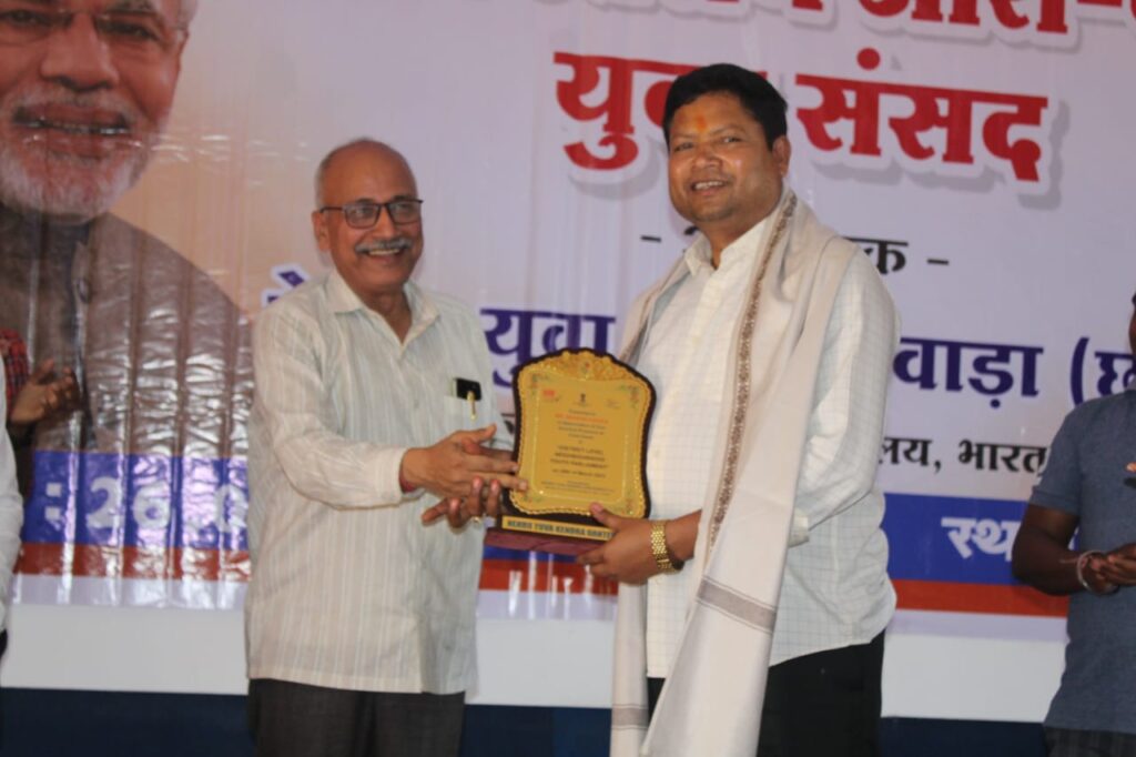 बीजापुर :- युवा एवं खेल मंत्रालय भारत सरकार द्वारा आयोजित नेहरू युवा केन्द्र संगठन की ओर से रविवार 26 मार्च को जिले मुख्यालय के आडिटोरियम में जिला स्तरीय आस-पड़ोस युवा संसद कार्यक्रम का आयोजन किया गया।इस आयोजन में छत्तीसगढ़ बीजेपी के पूर्व केबिनेट मंत्री रहे महेश गागड़ा मुख्य अतिथि व विशिष्ट अतिथि भाजपा जिलाध्यक्ष श्रीनिवास मुदलियार जी के रूप में सम्मिलित हुए। इस कार्यक्रम का आगाज युवाओं के प्रणेता रहे स्वामी विवेकानंद की शैलचित्र पर दीप प्रज्वलित कर छत्तीसगढ़ राज्य गीत के साथ किया गया। कार्यक्रम में सभी ने बारी-बारी से युवाओ के भारे में अपना वक्तव्य रखा।