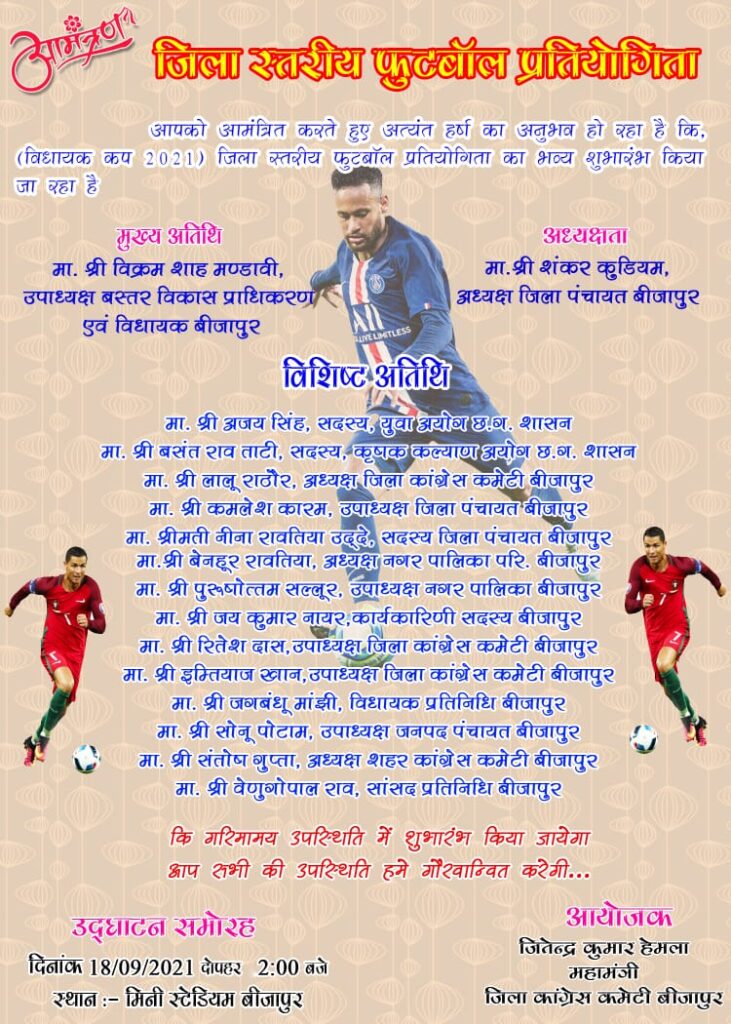 बीजापुर (राजेश जैन):- शनिवार 18 सितम्बर से जिला मुख्यालय बीजापुर में जिला स्तरीय फुटबॉल प्रतियोगिता का आयोजन होने जा रहा है,जिसका उद्धघाटन मैच दोपहर तीन बजे जनप्रतिनिधि व अधिकारी के बीच होना है, मिनी स्टेडियम में होने वाले विधायक कप टूर्नामेंट पहला शो मैच विधायक एकादश और अधिकारी एकादश के बीच शो मैच खेला जाएगा। इसके बाद गंगालूर और चेरामंगी के बीच मैच होगा।