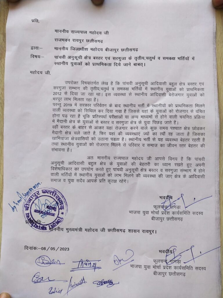 भाजयुमो प्रदेश कार्यसमिति सदस्य फुलचंद गागड़ा के नेतृत्व में स्थानीय भर्ती की मांग को लेकर युवा मोर्चा ने राज्यपाल के नाम ज्ञापन दिया है। ज्ञापन के माध्यम से राज्यपाल से मांग किया गया है कि अपने विशेषाधिकार का उपयोग करते हुए पांचवीं अनुसूची क्षेत्र में मिल रही स्थानीय भर्ती व्यवस्था को बहाल करने की मांग रखते हुए बताया गया है कि पूर्व में 2012 से तृतीय,चतुर्थ व समकक्ष भर्तियों में स्थानीयों को लाभ मिलता रहा है परन्तु सरकार परिवर्तन के बाद यह व्यवस्था को शिथिल किया गया है। जिससे स्थानीय आदिवासी सहित अन्य बेरोजगार युवा रोजगार से वंचित होंगें। साथ ही यह भी तर्क रखा गया है कि प्रतिस्पर्धा परीक्षाओं या अन्य माध्यमों से होने वाली चयनित प्रक्रिया में मैदानी क्षेत्र के युवाओं से बस्तर सरगुजा के युवा पिछड़ जाते हैं। तथा बस्तर के बाहर से आकर यहाँ रोजगार करने वाले कुछ समय पश्चात क्षेत्र छोड़कर मैदानी क्षेत्र चले जाते हैं फिर यहाँ की व्यवस्थाएं ज्यों का त्यों रह जाता है जिसका खामियाजा क्षेत्रवासियों को उठाना पड़ता है।