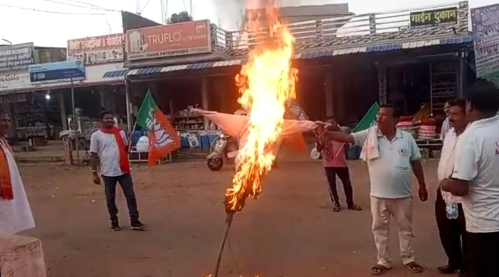 छोटे कापसी (राजदीप शर्मा):- भाजपा मंडल कापसी में शुक्रवार 12 मई की देर शाम को मुख्यमंत्री भूपेश बघेल का पुतला दहन किया गया। भाजपा कार्यकर्ताओं ने बताया कि छत्तीसगढ़ में 2 हजार करोड़ रूपए के कथित शराब घोटाले मामले को लेकर कांग्रेस सरकार के विरोध में अन्तागढ़ विधानसभा अंतर्गत कापसी मंडल में कार्यकर्ताओं के द्वारा कापसी नेताजी चौक पर मुख्यमंत्री भूपेश बघेल का पुतला दहन कर,प्रदेश की कांग्रेस सरकार के खिलाफ जमकर मुर्दाबाद,कांग्रेस सरकार होश में आओ,शराब घोटाला बंद करो के नारेबाजी की।