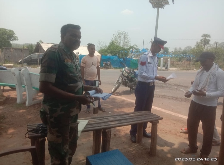 भोपालपटनम:- बीजापुर जिले के यातायात अधिकारी के निर्देश पर भोपालपटनम थाना प्रभारी टी आई सुरेंद्र कुमार यादव के मार्गदर्शन में आज दिनांक 24/5 /2023 को भोपालपटनम थाना अंतर्गत बी टी आई चौक तेलंगाना व महाराष्ट्र जाने वाली चौराहा पर दुपहिया एवं चार पहिया वाहनों पर दबिश देकर यातायात विभाग द्वारा चालान की कार्यवाही की गई ।इस दरमियान विभाग के अधिकारी कर्मचारियों के द्वारा दुपहिया चार पहिया वाहनों को रोककर ड्राइविंग लाइसेंस हेलमेट गाड़ी का संपूर्ण दस्तावेज की जांच की। और लोगों को युवाओं को यातायात नियमों का पालन करने का जानकारी दी गई। और दुपहिया वाहन चालकों को वाहन चलाते समय हेलमेट आवश्यक रूप से पहनने की हिदायत दी गई। क्योंकि बहुत से लोग बिना हेलमेट के चलने से दुर्घटनाएं आए दिन अधिक हो रहे हैं ।जिससे कुछ ही क्षणों में ही दुर्घटना से अपने अमूल्य जीवन को त्याग दे रहे है। ।और नशे की हालत में गाड़ी ना चलाने ओवर स्पीड ना चलाने दुपहिया वाहनों में तीन सवारी ना बैठाए 18 वर्ष से कम उम्र के बच्चों को गाड़ी ना चलाना दिया जाए। और रोड में चलते समय यातायात नियमों का पालन किया जाए। वाहन चलाते समय संपूर्ण दस्तावेजों को साथ रखने की जानकारी दी गई है। साथ ही चार पहिया वाहनों को ओवरलोड ना ले जाए ।और ड्राइवर सीट बेल्ट का उपयोग करें। वाहन चलाते समय अपने वाहन का संपूर्ण दस्तावेज साथ रखने की जानकारी दी गई है। वाहनों के जांच में बिना हेलमेट बिना ड्राइविंग लाइसेंस और मौके पर संपूर्ण दस्तावेज ना पेश करने पर 3900 रुपए की चालान काटा गया है। और लगभग 60 से 70 दुपहिया वाहन चालकों को समझाइश दिया गया। इस दरमियान श्री विजय मंडावी सहायक उप निरीक्षक श्री दिनेश खंडे प्रधान आरक्षक यातायात विभाग बीजापुर के कर्मचारी थाना के कर्मचारी मौजूद रहे हैं।