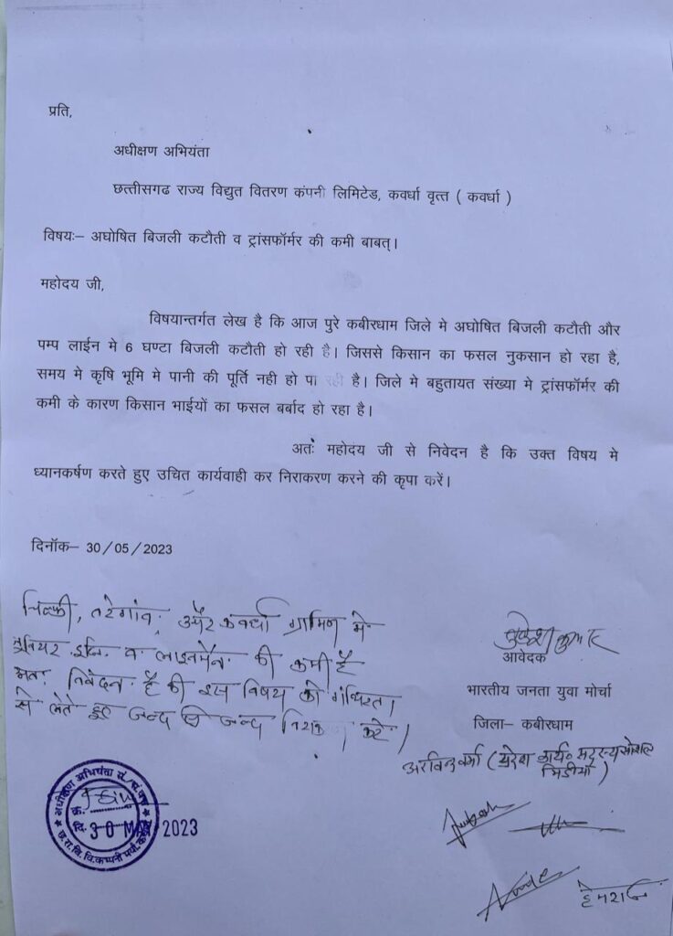 कवर्धा,,,जिले में हो रही अघोषित बिजली कटौती और ट्रांसफॉर्मर की कमी , कनिष्ठ अभियंता और लाइनमेंन की कमी हेतु अधीक्षण अभियन्ता को ज्ञापन सौंपा गया।