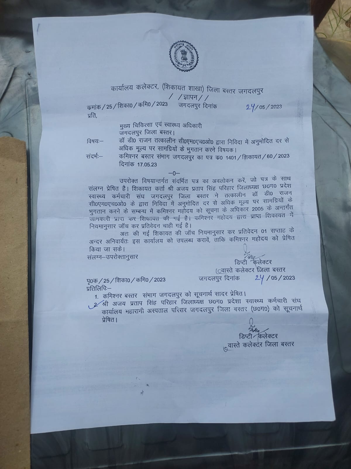 छत्तीसगढ़ प्रदेश स्वास्थ्य कर्मचारी संघ के प्रतिनिधि मंडल ने संघ के जिला अध्यक्ष अजय प्रताप सिंह परिहार के नेतृत्व में डॉ. डी राजन के खिलाफ गंभीर आरोप लगाते हुए बस्तर संभाग के आयुक्त के समक्ष लिखित शिकायत प्रस्तुत की थी।