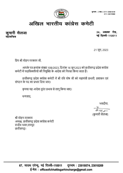 एक दिन पहले ही छत्तीसगढ़ प्रदेश कांग्रेस कमेटी के अध्यक्ष मोहन मरकाम के आदेश से प्रदेश कांग्रेस के पदाधिकारियों को नया प्रभार दिया गया था। जिसमें प्रभारी महामंत्री प्रशासन एवं संगठन की जिम्मेदारी अरुण सिसोदिया, महामंत्री रवि घोष बस्तर संभाग प्रभारी, महामंत्री अमरजीत चावला रायपुर शहर, यूथ कांग्रेस एवं एनएसयूआई प्रभारी, उपाध्यक्ष प्रतिमा चंद्राकर राजनांदगांव प्रभारी, महामंत्री चंद्रशेखर शुक्ला मोहला मानपुर प्रभारी, महामंत्री यशर्वधन राव प्रशिक्षण प्रभारी की जिम्मेदारी दी गई थी। सैलजा ने इसे रद्द कर दिया है।