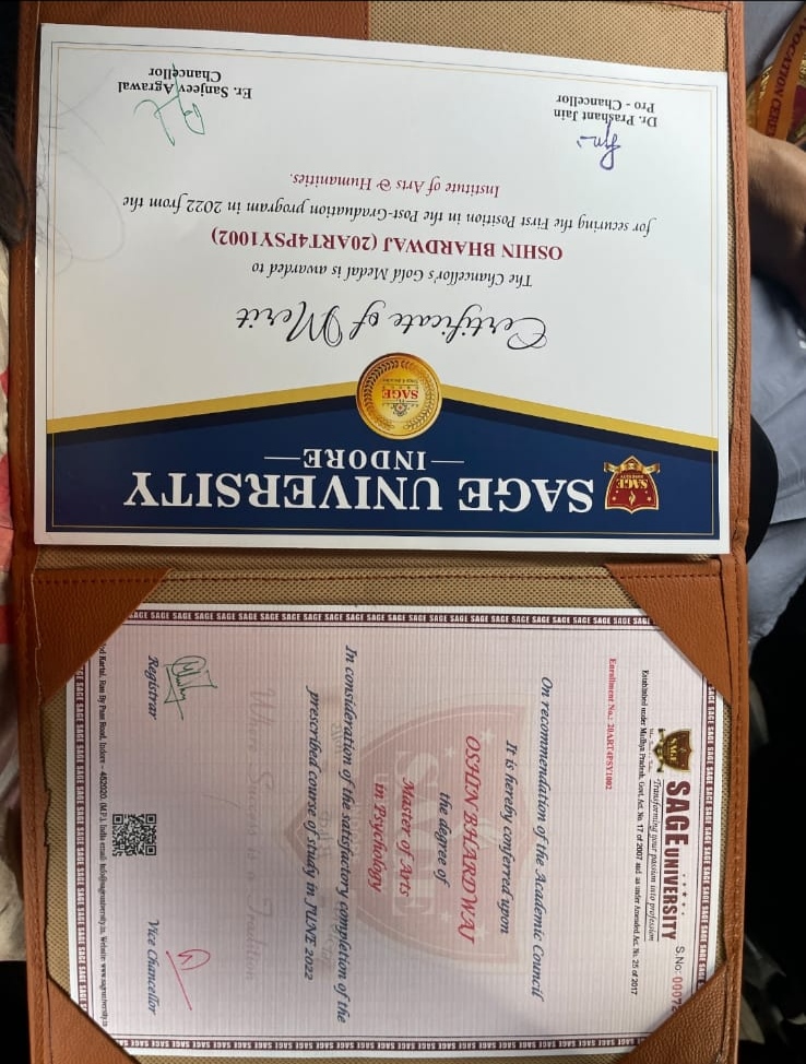 शहर की बेटी ओशिन भारद्वाज बनी सेज यूनिवर्सिटी की टॉपर