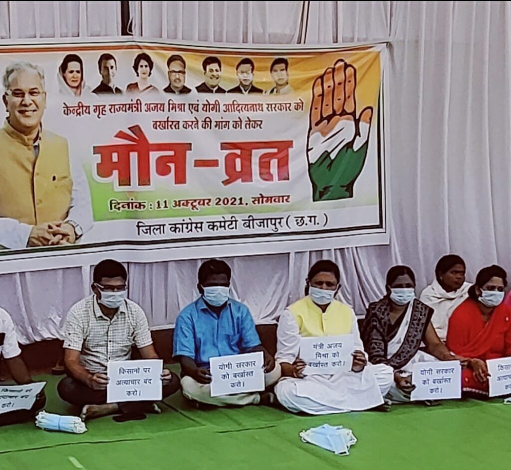 कांग्रेसियों ने केंद्रीय गृह राज्यमंत्री अजय मिश्रा को बर्खास्त करने की मांग को लेकर एक दिवसीय मौन व्रत रख कर विरोध जताया । इस दौरान युवा आयोग के सदस्य अजय सिंह, बस्तर विकास प्राधिकरण सदस्य व जिला पंचायत सदस्य नीना रावतिया, जिला पंचायत अध्यक्ष शंकर कुडियम, सहित पार्टी के समस्त प्रकोष्ठों के पदाधिकारी व कार्यकर्ता बड़ी संख्या में उपस्थित रहे ।
