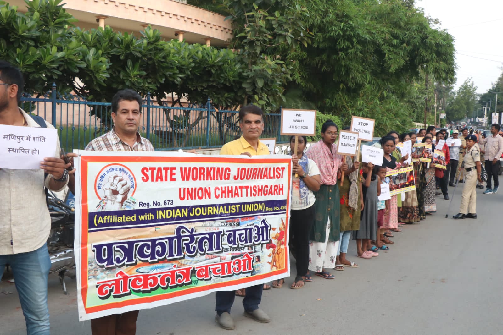 रायपुर :- मणिपुर में हो रही क्रूर हिंसा, महिलाओं के प्रति अत्याचार को रोकने, वहां शांति बहाली की मांग तथा मणिपुर में विगत कई महीनों से मीडिया को प्रतिबंधित करने एवं इंटरनेट को पूरी तरह बंद रखने के कारण , पत्रकारिता को हतोत्साहित करने की सरकारी कोशिशों को बंद करने की मांग को लेकर रायपुर में मानव श्रृंखला एवं सभा का आयोजन हुआ। 25 जुलाई की शाम स्टेट वर्किंग जर्नलिस्ट यूनियन ( आई जे यू) ने रायपुर शहर के प्रमुख सामाजिक संगठनों, ट्रेड यूनियन, किसान संगठन, शिक्षक संगठन, छात्रों संगठन, युवाओं, महिला संगठनों और आदिवासी संगठनों के कार्यकर्ताओं के साथ अंबेडकर प्रतिमा के समक्ष मानव श्रृंखला बनाकर प्रदर्शन किया।