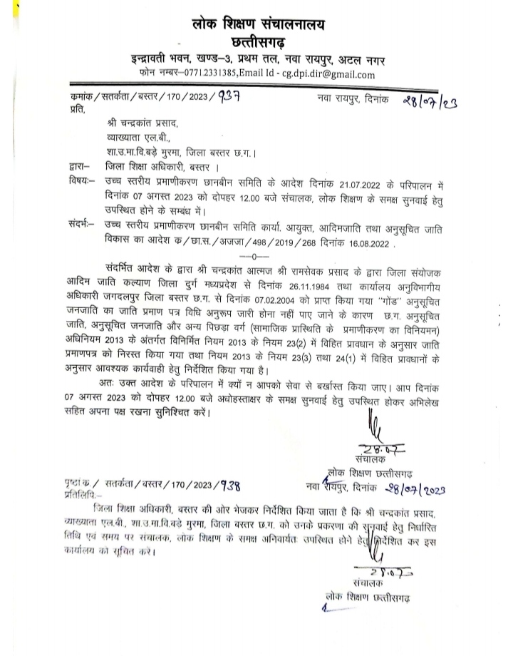 जगदलपुर(अर्जुन झा फर्जी जाति प्रमाण पत्र के जरिए आरक्षित वर्गों की नौकरी हथियाए बैठे लोगों के खिलाफ सरकार ने तगड़ा एक्शन लेना शुरू कर दिया है। इसी कड़ी में संचालक लोक शिक्षण ने दो व्याख्याताओं को नोटिस जारी कर अपने कार्यालय में तलब किया है। इन दोनों की नौकरी जाने की पूरी संभावना है।