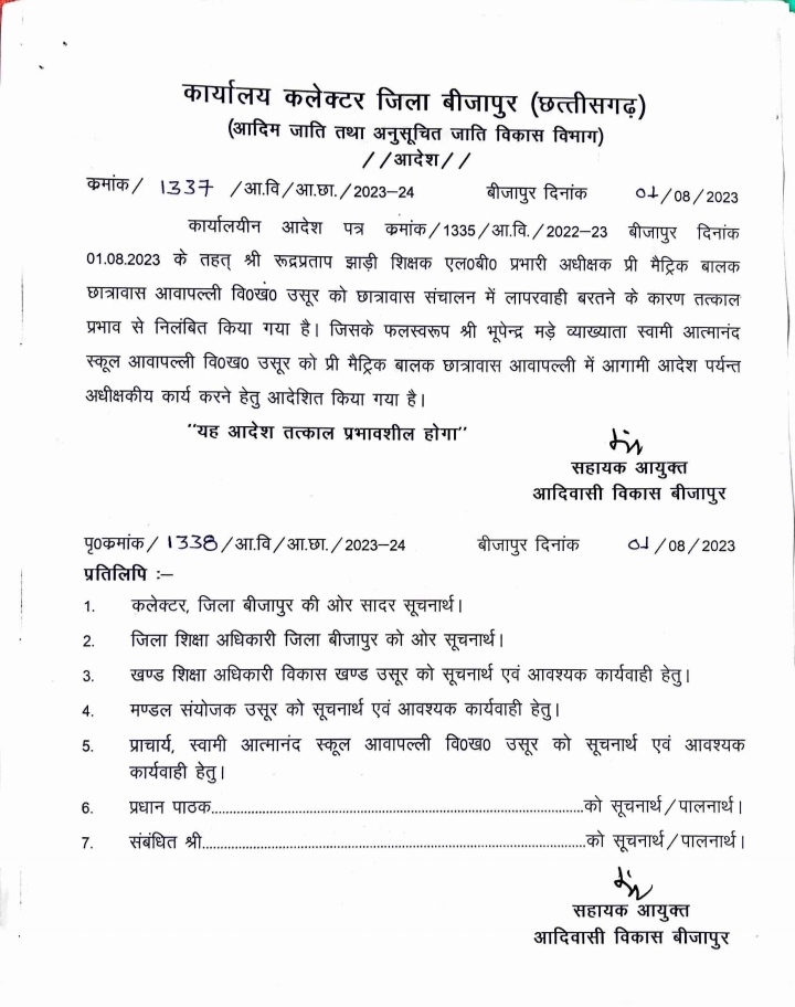 बीजापुर :- प्री मैट्रीक बालक छात्रावास आवापल्ली के घटना संबंधी विडियों वायरल होने पर कलेक्टर राजेन्द्र कुमार कटारा ने त्वरित कार्रवाई करने के निर्देश सहायक आयुक्त आदिवासी विकास केएस मशराम को दिए। कलेक्टर के निर्देशानुसार सहायक आयुक्त ने छात्रावास अधीक्षक को तत्काल प्रभाव से निलंबित कर दिया। वहीं मंडल संयोजक को घटना के संदर्भ में कारण बताओं नोटिस जारी किया है।