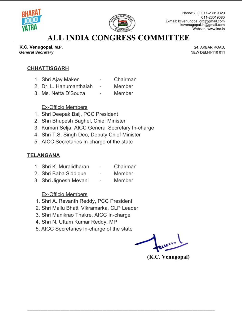अभा कांग्रेस कमेटी ने चुनाव वाले राज्यों छत्तीसगढ़, मध्यप्रदेश, राजस्थान व तेलंगाना के लिए चुनाव संचालन समितियां घोषित कर दी हैं। छत्तीसगढ़ Lmao लिए गठित चुनाव संचालन समिति के अध्यक्ष वरिष्ठ नेता अजय माकन को बनाया गया है। डॉ. एल हनुमत्तईया व नेट्टा डिसूजा को सदस्य तथा मुख्यमंत्री भूपेश बघेल, प्रदेश कांग्रेस अध्यक्ष दीपक बैज, प्रदेश प्रभारी राष्ट्रीय महासचिव कुमारी शैलजा, उप मुख्यमंत्री टीएस सिंहदेव बाबा, प्रदेश कांग्रेस प्रभारी डॉ. चंदन यादव, सप्तगिरी शंकर उल्का व विजय जांगिड़ बनाए गए हैं