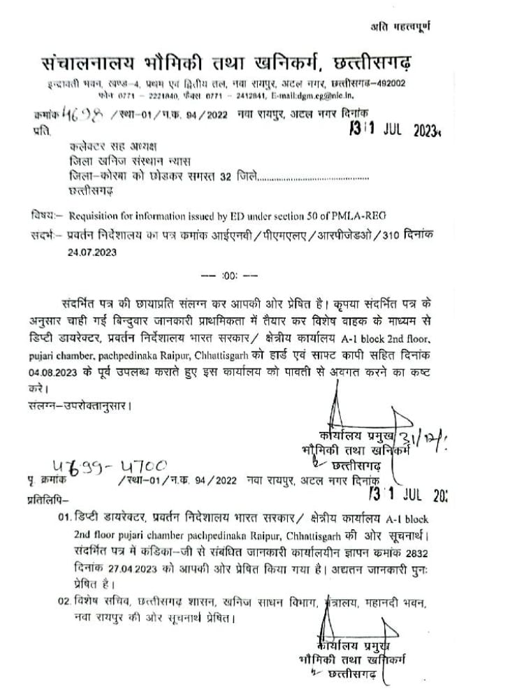 जगदलपुर :- ईडी द्वारा चाही गई जानकारी देने में भौमिकी एवं खनिज विभाग के डायरेक्टर की पहल पर सभी जिला कलेक्टरों ने तत्परता दिखाई है। ईडी के अचानक उठाए गए कदम से प्रशासन तंत्र, ठेकेदारों और सप्लायर्स में हड़कंप मच गया है।