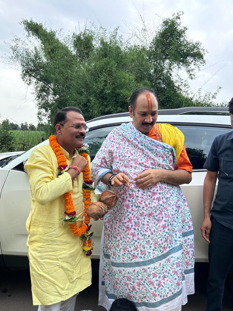 कवर्धा :- श्रावण सोमवार के दिन प्रसिद्ध शिव पुराण के अंतर्राष्ट्रीय कथाकार पंडित प्रदीप मिश्रा जी महाराज का तिल्दा से सीहोर जाने के दौरान अल्प समय के लिए कवर्धा आगमन हुआ। इस दौरान उन्होंने श्रीगणेशपुरम में पतंजलि किसान सेवा समिति के राज्य प्रभारी गणेश तिवारी से सपरिवार आत्मीयतापूर्ण मुलाकात करते हुए आशीर्वाद प्रदान किया। अपने अल्पप्रवास के दौरान श्रीगणेशपुरम में हुए कार्यक्रमों की सराहना करते हुए गणेश तिवारी के आग्रह पर आने वाले समय पर पुनः कवर्धा के कार्यक्रम में आने की बात कही।