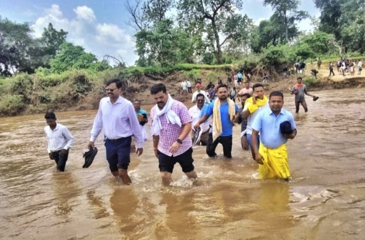 बीजापुर :-बारिश और बाढ़ के बाद विधायक व कलेक्टर प्रभावित क्षेत्रों के दौरे पर हैं। आज गंगालुर क्षेत्र में कोटेर जाने के लिए विधायक, कलेक्टर विभागीय अधिकारियों के साथ निकले। कोटेर पहुंचने में बाधा बनी मिंगाचल नदी कमर से थोड़ी नीचे बह रही थी। 1 हजार के जनसंख्या वाले इस गांव में लोगों की समस्या सुनने विधायक विक्रम मंडावी और कलेक्टर राजेन्द्र कटारा ने पैदल नदी पार किया।