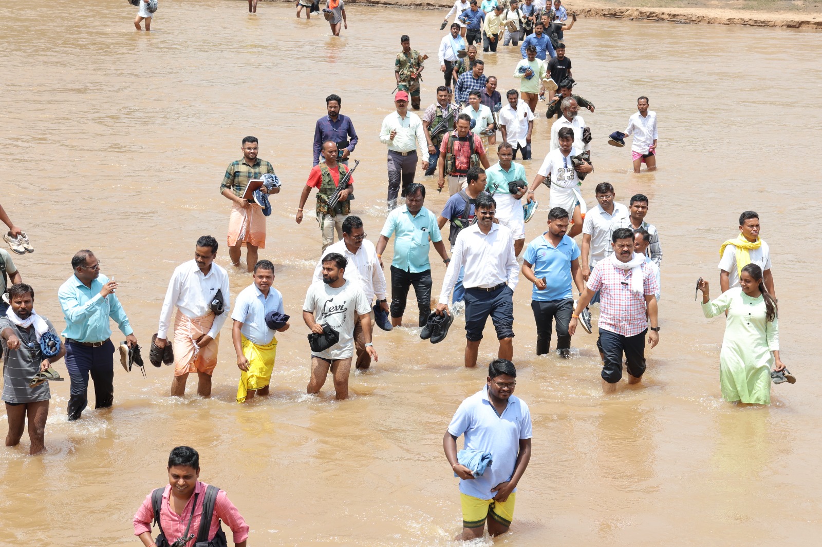 जिले के सुदूर एवं संवेदनशील क्षेत्र कोटेर में पहुंचने के लिए कमर तक नदी के पानी को पार कर पहुंचा प्रशासन