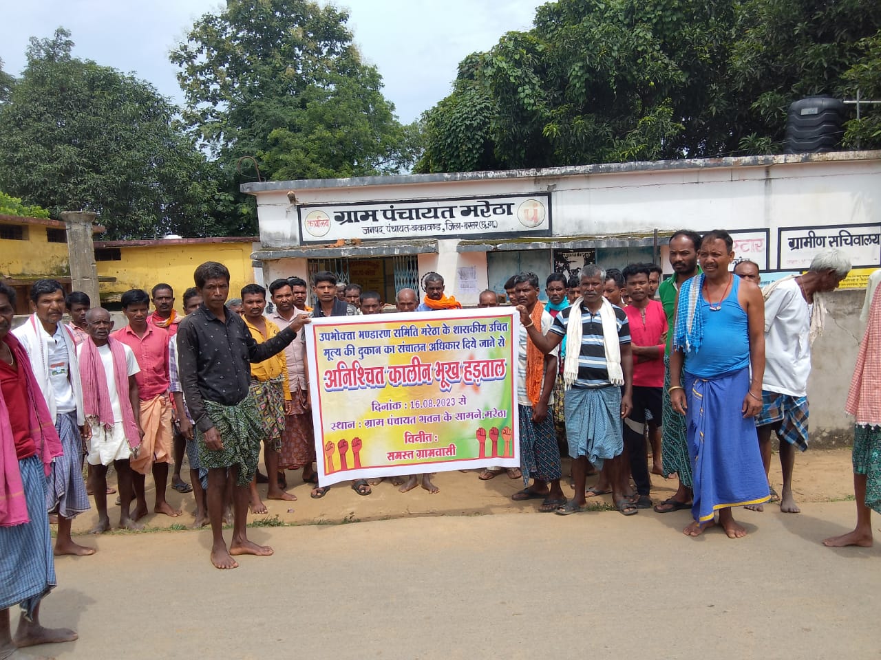 मरेठा की शासकीय उचित मूल्य की दुकान के संचालन की जिम्मेदारी ग्राम पंचायत को न देकर प्राथमिक सहकारी उपभोक्ता भंडार मरेठा को दे दी जाने से ग्रामीण बेहद नाराज हो उठे हैं। ग्रामीणों की मंशा है कि राशन दुकान को ग्राम पंचायत के माध्यम से चलाया जाए, मगर एसडीएम ने राजनैतिक दबाव में आकर दुकान संचालन की जिम्मेदारी प्राथमिक सहकारी उपभोक्ता भंडार को सौंप दी है। इसके विरोध में तीन दिन पहले मरेठा के सभी ग्रामीण अपने बाल बच्चों के साथ सड़क पर उतर आए थे। ग्रामीणों ने मुख्य मार्ग पर चक्काजाम कर दिया और ग्राम देवता के आसन, छत्र, डोली आदि को यह कहते हुए ग्राम पंचायत के सामने रख दिया था कि इन्हें भी उपभोक्ता भंडार को सौंप दिया जाए। विधायक लखेश्वर बघेल के खिलाफ भी ग्रामीणों की नाराजगी साफ नजर आ रही थी। वे विधायक का नाम लेकर मुर्दाबाद के नारे लगा रहे थे और एसडीएम को भी कोस रहे थे। एसडीएम द्वारा राशन दुकान प्राथमिक सहकारी उपभोक्ता भंडार को सौंपे जाने का विरोध करते हुए ग्रामीणों ने कलेक्टर बस्तर को आवेदन दिया था। इसके बाद राशन दुकान पुनः ग्राम पंचायत को सौंप दिया गया था। बाद में एसडीएम ने राजनैतिक दबाव का हवाला देते हुए इस आदेश को निरस्त कर राशन दुकान संचालन की जिम्मेदारी प्राथमिक सहकारी उपभोक्ता भंडार मर्यादित मरेठा को देने का आदेश दे दिया। 11 अगस्त को खाद्य निरीक्षक बकावंड और पुलिस बल की मौजूदगी में दुकान प्राथमिक सहकारी उपभोक्ता भंडार को दे दी गई और उचित मूल्य की दुकान में ताला लगा दिया गया। इस कार्रवाई से ग्राम पंचायत मरेठा के सभी ग्रामीण आक्रोशित हो उठे। ग्रामीण मेन रोड पर पहुंचकर चक्काजाम करने लगे। विरोध प्रदर्शन में दिनभर ग्राम पंचायत के हर परिवार के सभी सदस्य सड़क पर बैठे रहे। ग्रामीणों का कहना है कि क्षेत्रीय विधायक लखेश्वर बघेल के कार्यकर्ताओं को खुश करने के लिए राशन दुकान प्राथमिक सहकारी उपभोक्ता भंडार को दे दी गई है। चक्काजाम और प्रदर्शन कर रहे ग्रामीण बस्तर विधायक लखेश्वर बघेल मुर्दाबाद का नारा लगा रहे थे। ग्राम के गायता, पुजारी, पटेल, कोटवार सभी लोग मिलकर ग्राम देवी देवता के आसनों, छत्र, डोली, नगाड़ा, मोहरी आदि को भी प्राथमिक उपभोक्ता भंडार सहकारी समिति को सौंपने के लिए पंचायत के पास रख दिया था। ग्रामीणों ने राशन दुकान में ओर से ताला जड़ दिया था। मसले का अब तक समाधान न निकाले जाने से आक्रोशित ग्रामीणों ने 16 अगस्त से ग्राम पंचायत के सामने इकठ्ठा होकर सामूहिक भूख हड़ताल शुरू कर दी है। भूख हड़ताल पर सरपंच उदव राम कश्यप, लोचन सोनवानी, गिरधर कश्यप, नवल किशोर साहू, कुंवर सिंह बघेल, सुदरू पुजारी, गंगा पुजारी, गांव के प्रमुख पुजारी चमरा राम पुजारी तथा दर्जनों ग्रामीण भूख हड़ताल पर बै