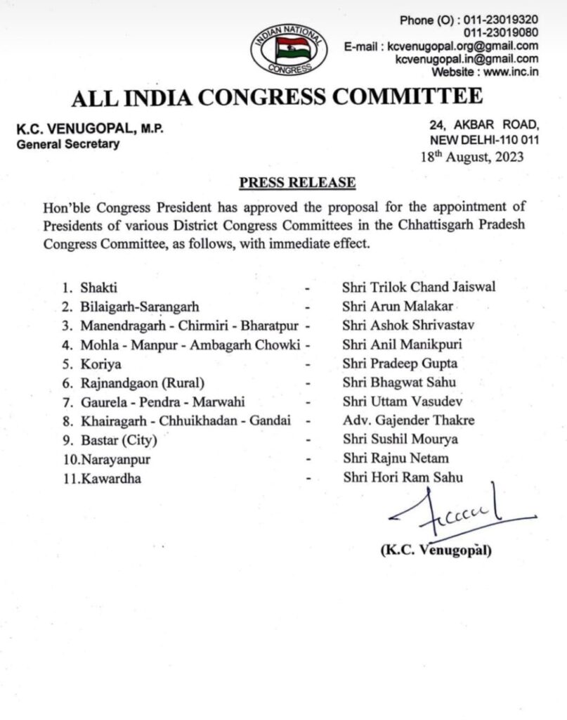 प्रदेश कांग्रेस अध्यक्ष दीपक बैज की अनुशंसा पर अभा कांग्रेस कमेटी ने छत्तीसगढ़ के नए जिलों समेत बस्तर शहर सहित अन्य जिलों के रिक्त अध्यक्ष पदों पर नियुक्ति आदेश जारी किया है। पार्टी के राष्ट्रीय महासचिव केसी वेणुगोपाल के हस्ताक्षर से जारी आदेश में बस्तर जिला शहर कांग्रेस कमेटी के अध्यक्ष पद पर सांसद दीपक बैज के जिला प्रतिनिधि सुशील मौर्य की नियुक्ति की है। यह पद राजीव शर्मा के इस्तीफे के बाद रिक्त हुआ था। युवा और तेज तर्रार तथा कर्मठ नेता को शहर जिला अध्यक्ष बनाया जाना कांग्रेस के लिए बड़ा ही लाभकारी होगा। श्री मौर्य लंबे समय से भाजपा के खिलाफ आक्रामक तेवर दिखाते आए हैं। वे पार्टी के कार्यक्रमों में सक्रिय भागीदारी देते रहते हैं। उनकी नियुक्ति से जगदलपुर के कार्यकर्त्ताओं में खुशी की लहर दौड़ गई है। कार्यकर्त्ताओं यहां स्थित कांग्रेस कार्यालय और श्री मौर्य के निवास के समक्ष जमकर आतिशबाजी की और मिठाईयां बांटी। कार्यकर्त्ता भूपेश बघेल, दीपक बैज और सुशील मौर्य जिंदाबाद के नारे लगाते रहे। सुशील मौर्य की नियुक्ति पर विधायक रेखचंद जैन, सांसद दीपक बैज के सोशल मीडिया प्रभारी एवं शहर जिला युवा कांग्रेस के महासचिव अनुराग महतो समेत अनेक नेताओं ने खुशी जताते हुए उन्हें बधाई एवं शुभकामनाएं दी हैं। सुशील मौर्य ने कहा है कि पार्टी ने जिस उम्मीद के साथ उन्हें यह दायित्व सौंपा है, उस पर वे सौ फीसदी खरा उतरने का भरसक प्रयास करेंगे।