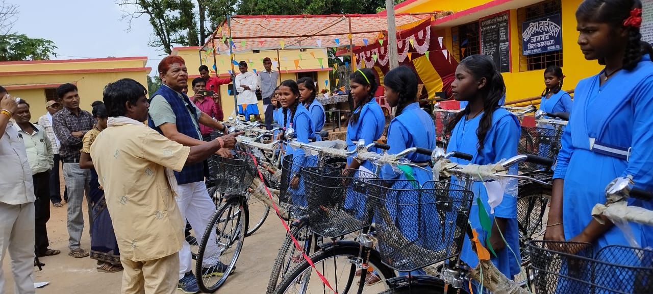 विधायक नारायणपुर एवं छत्तीसगढ़ हस्तशिल्प विकास बोर्ड के अध्यक्ष चंदन कश्यप ने मंगलवार को शासकीय हाई स्कूल जामगांव मे कक्षा 9वीं में अध्ययनरत छात्राओं को छत्तीसगढ़ शासन की महत्वपूर्ण योजना सरस्वती साइकिल योजना के तहत निशुल्क साइकिल वितरण किया। विधायक चंदन कश्यप ने कार्यक्रम के दौरान सभी छात्र- छात्राओं को उज्वल भविष्य की शुभकामनाएं दीं। श्री कश्यप ने कहा कि प्रदेश के विद्यार्थियों को बेहतर शिक्षा उपलब्ध कराने के लिए हमारी सरकार प्रतिबद्ध है। हिंदी माध्यम के साथ साथ अंग्रेजी माध्यम की भी शिक्षा उपलब्ध कराने में हमारी सरकार सफल साबित हुई है। प्रदेश के मुख्यमंत्री भूपेश बघेल के नेतृत्व और उनकी दूरगामी सोच का परिणाम है कि आज प्रदेश में शिक्षा क्रांति आ चुकी है। भाजपा के शासनकाल में आदिवासी क्षेत्रो के स्कूलों को बंद करने का कार्य किया गया। हमारी कांग्रेस सरकार ने 5 साल में बंद पड़े स्कूलों को खोलने का कार्य किया। भूपेश सरकार द्वारा शिक्षा के क्षेत्र मे किए गए कार्य सराहनीय हैं।इस अवसर पर सरपंच गुड़िया मौर्य, उप सरपंच मेहतू राम मौर्य, सोमनाथ मौर्य, जयलाल कश्यप, महेश नाग, महेंद्र पांडे, गणेश यादव, सांतो मौर्य, छात्र छात्राएं, शिक्षक एवं ग्रामीण उपस्थित थे।