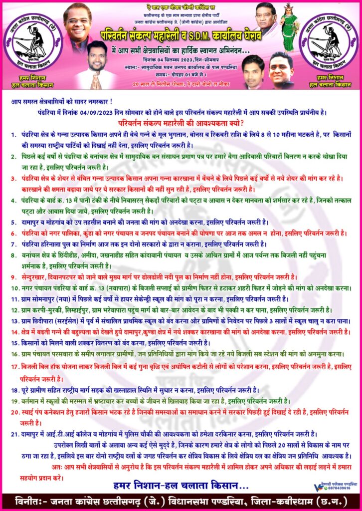 चंद्रवंशी द्वारा पंडरिया में होने वाले परिवर्तन संकल्प महारैली में गन्ना किसानों की मुख्य समस्याओ पर आवाज उठाई जा रही है इस लिए क्षेत्र के सभी किसान भाइयों की उपस्थिति के साथ साथ कुकदूर, कोदवागोडान, नेउर, पंडरिया,महली, महका, मोहगांव, कुन्डा, दामापुर, मरका, झलमला, इंदौरी, दसरँगपुर, सहित वीरेन्द्रनगर छेत्र के लोगो को शामिल होने का आग्रह किया गया है