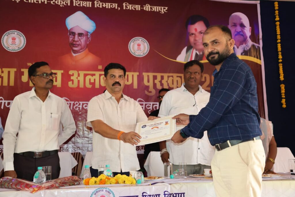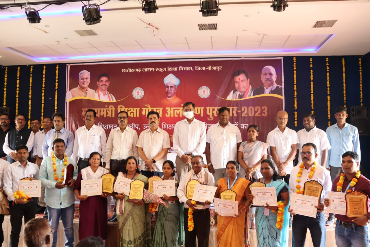 बीजापुर :- 05 सितंबर को देश के प्रथम उपराष्ट्रपति स्वर्गीय श्री सर्वपल्लीय राधाकृष्णन के जन्म दिवस को शिक्षक दिवस के रूप में मनाया जाता है। शिक्षकों के समाज में अतुलनीय योगदान होता है जिसे इस दिवस को विशेष रूप से शिक्षको को सम्मानित करने विविध कार्यक्रम आयोजित होते है। छत्तीसगढ़ शासन द्वारा उत्कृष्ट कार्य करने वाले शिक्षकों को मुख्यमंत्री शिक्षा गौरव अलंकरण सहित विभिन्न पुरूस्कारों से सम्मानित किया जाता है। इसी क्रम में जिला स्तर कार्यक्रम का आयोजन बीजापुर स्थित आडिटोरियम में आयोजित हुआ जिसमें कार्यक्रम के मुख्य अतिथि क्षेत्रीय विधायक एवं बस्तर विकास प्राधिकरण के उपाध्यक्ष विक्रम शाह मंडावी ने जिले के 12 शिक्षकों को मुख्यमंत्री शिक्षा गौरव अलंकरण “शिक्षादूत” पुरूस्कार 2023 से सम्मानित किया। जिसमे भोपालपटनम ब्लाक के 03 प्रधान पाठक, बीजापुर ब्लाक के 03, भैरमगढ़ एवं उसूर ब्लाक के 3-3 प्रधान पाठकों एवं सहायक शिक्षको को प्रदान किया गया। इस पुरूस्कार के साथ 5 हजार रूपए एवं प्रशस्ति पत्र, स्मृति चिन्ह, शाल एवं श्रीफल भेंट कर सम्मानित किया।