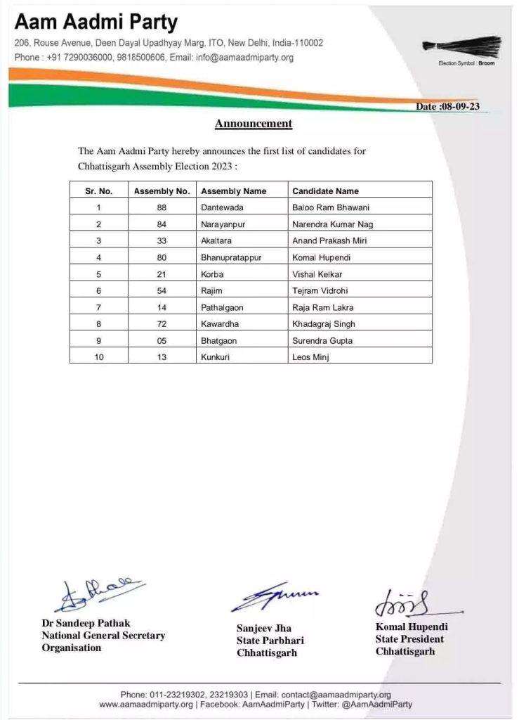 आम आदमी पार्टी की पहली सूची जारी, भानुप्रतापपुर से प्रदेश अध्यक्ष कोमल हुपेंडी तो दंतेवाड़ा से बालू राम भवानी को बनाया गया उम्मीदवार