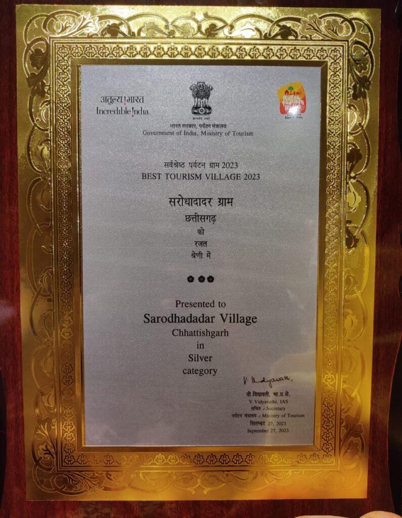 कवर्धा :- विश्व पर्यटन दिवस के अवसर पर केन्द्रीय पर्यटन मंत्रालय द्वारा इस वर्ष छत्तीसगढ़ के कबीरधाम जिले के सरोधा-दादर गाँव को राष्ट्रीय स्तर पर रजत श्रेणी में सर्वश्रेष्ठ पर्यटन ग्राम का पुरस्कार दिया गया है। सरोधा दादर को देश भर के 795 पर्यटन ग्रामों की प्रतियोगिता में विभिन्न मापदंडों के आधार पर सर्वश्रेष्ठ ग्राम के रूप में चुना गया। पर्यटन दिवस के अवसर पर नई दिल्ली भारत मंडपम में आयोजित समारोह में सरोधादादर गाँव के मंगल सिंह धुर्वे ने यह पुरस्कार ग्रहण किया। मुख्यमंत्री श्री भूपेश बघेल, पर्यटप मंत्री श्री ताम्रध्वज साहू, कैबिनेट मंत्री व कवर्धा विधायक श्री मोहम्मद अकबर ने भारतीय पर्यटन मानचित्र पर कबीरधाम जिले के ग्राम सरोदा दादर को राष्ट्रीय स्तर पर रजत श्रेणी में सर्वश्रेष्ठ पर्यटन ग्राम का पुरस्कार मिलने पर बधाई एवं शुभकामनाएं दी है।