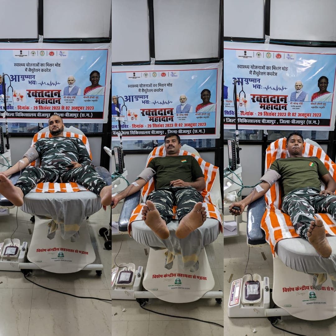 बीजापुर :- जिले में दिनांक 29/09/2023 से 02/10/2023 तक चल रहे आयुष्मान भवः रक्तदान महादान शिविर का आयोजन में दिनांक 30/09/2023 को ब्लड बैंक जिला चिकित्सालय बीजापुर में सीआरपीएफ के जवानों ने रक्त दान किया गया । जिसमे 85 वी0 वाहिनी केन्द्रीय रिजर्व पुलिस बल नयापारा बीजापुर के कमांडेंट जे0 वी0 तुसिंग के निर्देशन में 85 वी0 वाहिनी के कई जवानांे ने रक्तदान करने के लिए बढ़ चढ़ कर हिस्सा लिया एवं रक्तदान किया। आयुष्मान भवः रक्तदान महादान शिविर जैसे समाज कल्याणकारी योजना को सफल बनाने में महत्वपूर्ण भूमिका निभाई। 85 वी0 वाहिनी केन्द्रीय रिजर्व पुलिस बल के जवानों द्वारा अतिसंवेदनशील परिचालनिक ड्यूटी के अलावा समाज कल्याणकारी योजना, मानवता व सामाजिक दायित्व के प्रति अपना महत्वपूर्ण योगदान भी देती है।