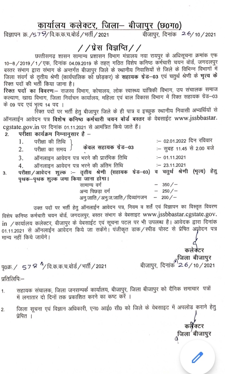 छत्तीसगढ़ शासन सामान्य प्रशासन विभाग मंत्रालय नवा रायपुर के अधिसूचना क्रमांक एक 10-8/2019 दिनांक 04-09-2019 के तहत गठीत विशेष कनिष्ठ कर्मचारी चयन बोर्ड जगदलपुर बस्तर संभाग द्वारा सम्भाग के अंतर्गत बीजापुर जिले के स्थानीय निवासियों से जिले के विभिन्न विभागों में जिला संवर्ग के तृतीय श्रेणी (कार्यपालिक को छोड़ कर) के सहायक ग्रेड-3 एवं चतुर्थ श्रेणी के भृत्य के रिक्त पदों की भर्ती राजस्व विभाग, कोषालय, लोक स्वास्थ्य यांत्रिकी विभाग, उप संचालक समाज कल्याण ,खाद्य विभाग, जिला निर्वाचन कार्यालय, महिला एवं बाल विकास विभाग किया जाना है । उक्त भर्ती में जिले के ही पात्र व इछुक स्थानीय निवासी अभ्यर्थियों से ऑनलाइन आवेदन पत्र विशेष कनिष्ठ कर्मचारी चयन बोर्ड बस्तर के वेबसाइट www.jssbbastar.cgstate.gov.in पर दिनांक 01-11-2021 से आमंत्रित किये जायेंगे ।