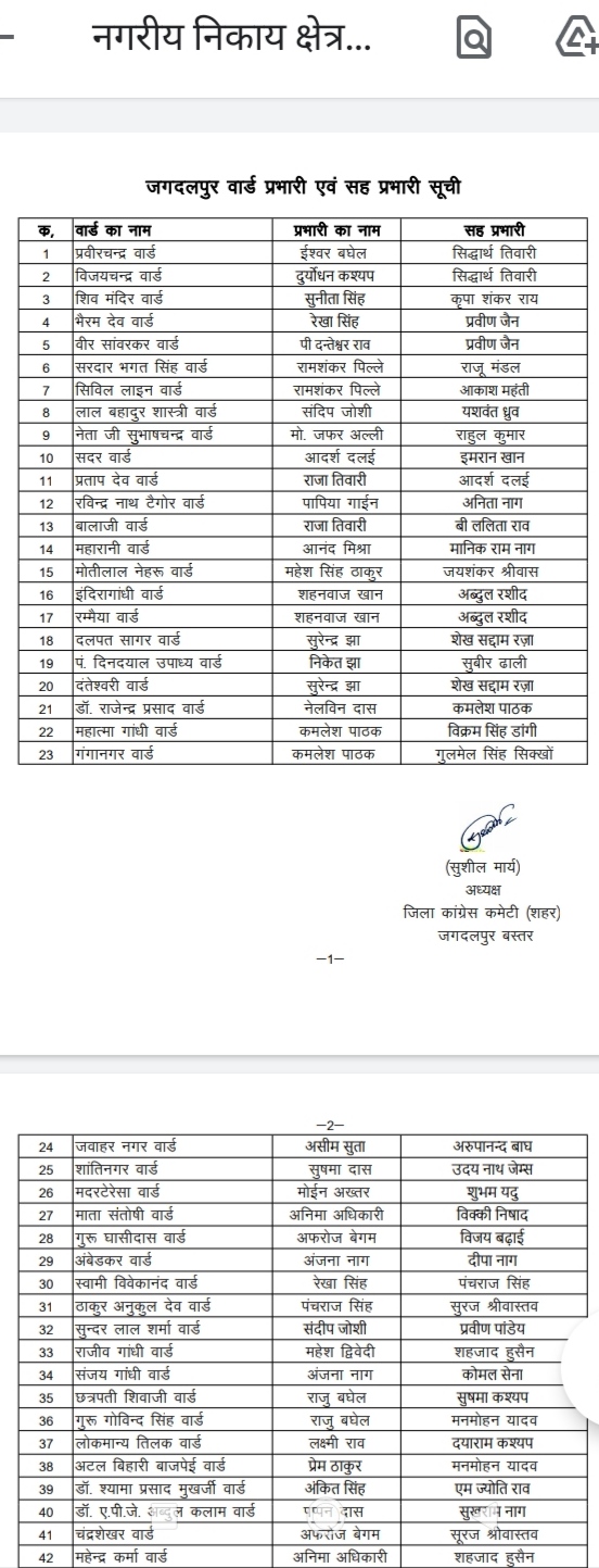 जगदलपुर :- शहर जिला कांग्रेस अध्यक्ष सुशील मौर्य ने जगदलपुर नगरीय निकाय क्षेत्र के सभी 48 वार्डों में प्रभारियों और सह प्रभारियों की नियुक्ति की है।