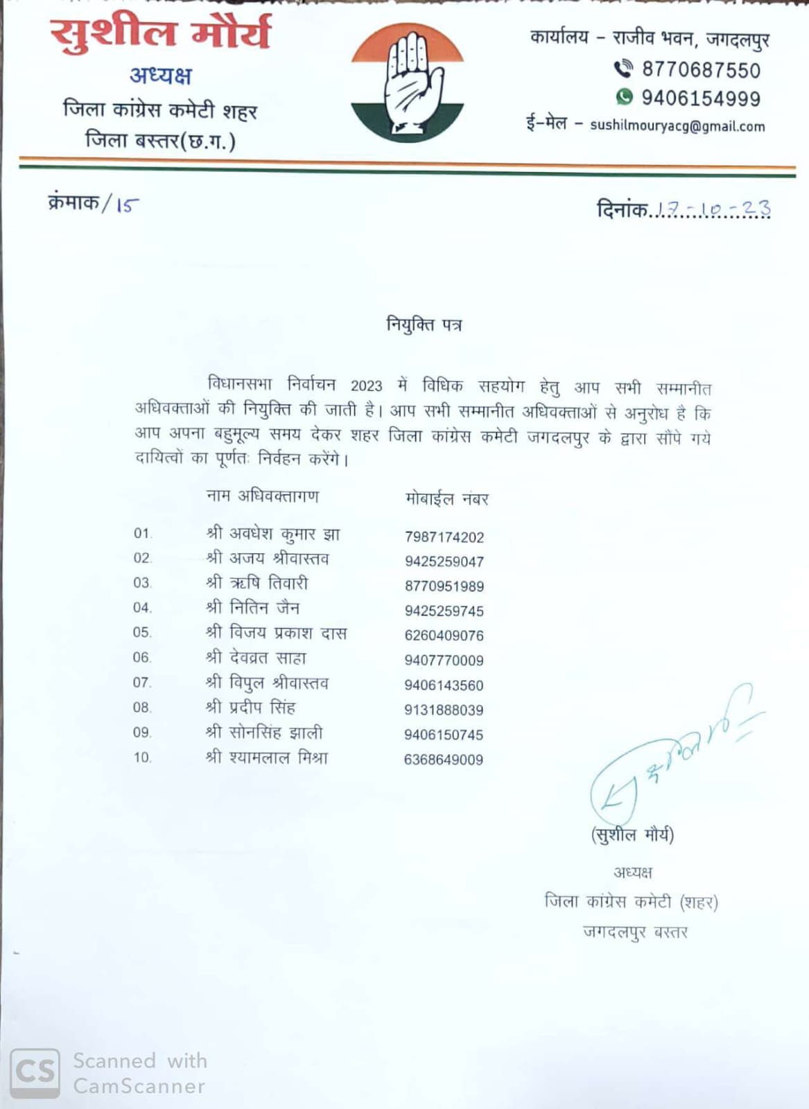 जगदलपुर :- चुनाव के दौरान कांग्रेस की कानूनी मदद करने के लिए दस वकीलों की टीम तैयार की गई है। शहर जिला कांग्रेस कमेटी के अध्यक्ष सुशील मौर्य ने वकीलों की यह टीम बनाई है। वकीलों के नाम व उनके सेलफोन नंबर भी श्री मौर्य ने जारी किए हैं।