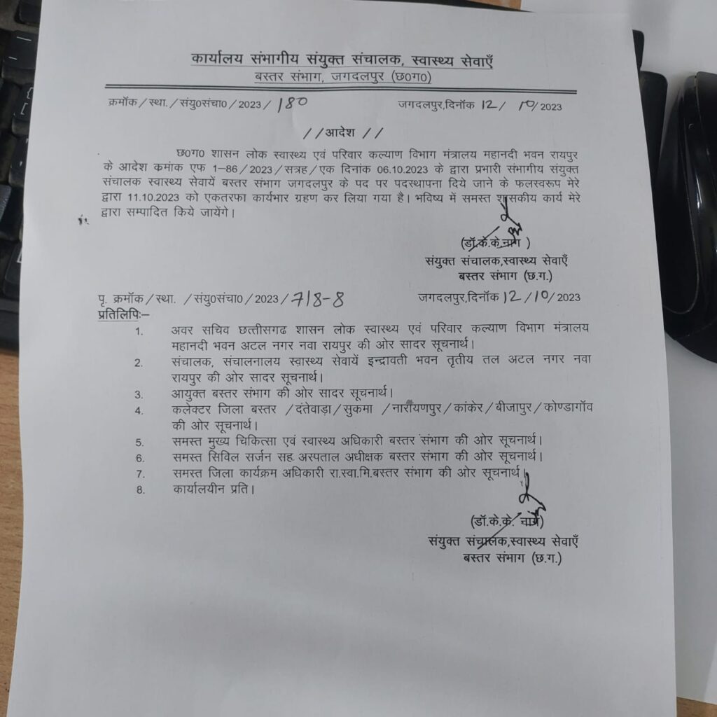 जगदलपुर स्थित जिला चिकित्सालय महारानी अस्पताल के चिकित्सक एवं पैथोलॉजिस्ट डॉ. केके नाग की पद स्थापना संयुक्त संचालक स्वास्थ्य सेवाएं बस्तर संभाग के पद पर चुनाव आचार संहिता लगने के कुछ दिनों पहले 6 अक्टूबर को की गई थी। डॉ. नाग ने उस समय अपना नया पदभार ग्रहण नहीं किया। आचार संहिता लागू हो जाने के बाद उन्होंने 12 अक्टूबर को एकतरफा पदभार सम्हाल लिया। इस बात की पुष्टि स्वयं डॉ. केके नाग ने अपने एक परिपत्र में की है। 12 अक्टूबर की तिथि पर जारी इस विभागीय सर्कुलर में लिखा है कि छत्तीसगढ़ शासन के स्वास्थ्य एवं परिवार कल्याण मंत्रालय महानदी भवन रायपुर के आदेश दिनांक 6- 10- 2023 के तहत मेरी पद स्थापना प्रभारी संयुक्त संचालक स्वास्थ्य एवं परिवार कल्याण विभाग बस्तर जगदलपुर के पद पर की गई है। इस आदेश के परिपालन में मेरे द्वारा दिनांक 11- 10- 2023 को एकतरफा पदभार ग्रहण कर लिया गया है। भविष्य में विभाग के समस्त शासकीय कार्य मेरे द्वारा संपादित किए जाएंगे। डॉ. केके नाग ने इस सर्कुलर की प्रतिलिपि विभाग के अवर सचिव व संचालक, संभाग आयुक्त, बस्तर, सुकमा, कांकेर, कोंडागांव, नारायणपुर, दंतेवाड़ा व बीजापुर जिलों के कलेक्टरों, मुख्य चिकित्सा एवं स्वास्थ्य अधिकारियों, सिविल सर्जनों, अस्पताल अधीक्षकों और जिला कार्यक्रम अधिकारियों को भी प्रेषित की है। डॉ. केके नाग का यह कदम चुनाव आचार संहिता का खुला उल्लंघन है। केंद्रीय निर्वाचन आयोग ने विधानसभा चुनाव के परिप्रेक्ष्य में छत्तीसगढ़ में आदर्श आचार संहिता 9 अक्टूबर से ही लागू कर दी है। डॉ. नाग के चुनाव आचार संहिता विरोधी कदम की तस्दीक राज्य की मुख्य निर्वाचन पदाधिकारी रीना बाबा साहेब कंगाले द्वारा जारी सर्कुलर से भी होती है।