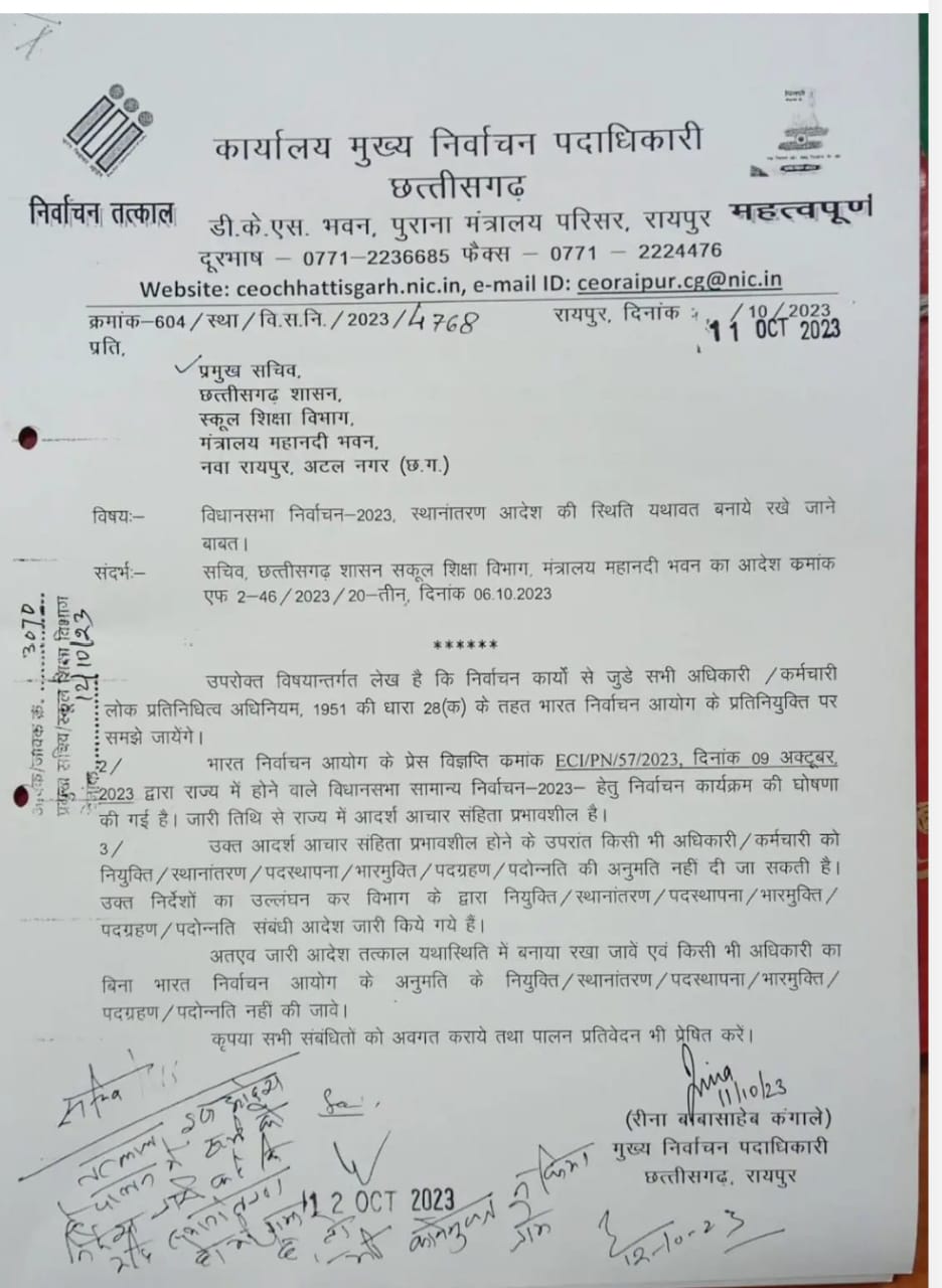 लोक प्रतिनिधित्व अधिनियम 1951 की धारा 28 (क) के अनुसार चुनाव तिथियों के लिए अधिसूचना जारी होते ही समस्त शासकीय अधिकारी कर्मचारी निर्वाचन आयोग की प्रतिनियुक्ति पर समझे जाते हैं। छत्तीसगढ़ की मुख्य निर्वाचन पदाधिकारी रीना बाबासाहेब कंगाले ने शिक्षकों व विभागीय अधिकारियों के तबादले व पदस्थापना के संदर्भ में छत्तीसगढ़ शासन के शिक्षा विभाग के प्रमुख सचिव के नाम जारी पत्र में इस बात का उल्लेख किया है। सुश्री कंगाले ने इस पत्र में लिखा है कि आदर्श आचार संहिता प्रभावशील होने के बाद किसी भी अधिकारी – कर्मचारी को नियुक्ति, स्थानांतरण, पदस्थापना, भारमुक्ति, पदग्रहण की अनुमति नहीं दी जा सकती। इसके हवाले से उन्होंने शिक्षा विभाग में हुए स्थानांतरण पर यथास्थिति रखने के आदेश दिए हैं।