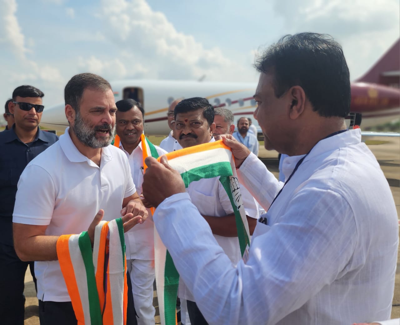 जगदलपुर :- कांग्रेस प्रत्याशियों के पक्ष में चुनावी सभा को संबोधित करने जगदलपुर आए कांग्रेस के पूर्व राष्ट्रीय अध्यक्ष राहुल गांधी का वरिष्ठ कांग्रेस नेता एवं संसदीय सचिव रेखचंद जैन ने आत्मीय स्वागत किया। श्री जैन ने जगदलपुर स्थित मां दंतेश्वरी एयरपोर्ट पर राहुल को तिरंगा गमछा भेंटकर उनका अभिनंदन किया। इस दौरान प्रदेश कांग्रेस अध्यक्ष दीपक बैज व शहर जिला कांग्रेस अध्यक्ष सुशील मौर्य भी विमानतल पर मौजूद थे।