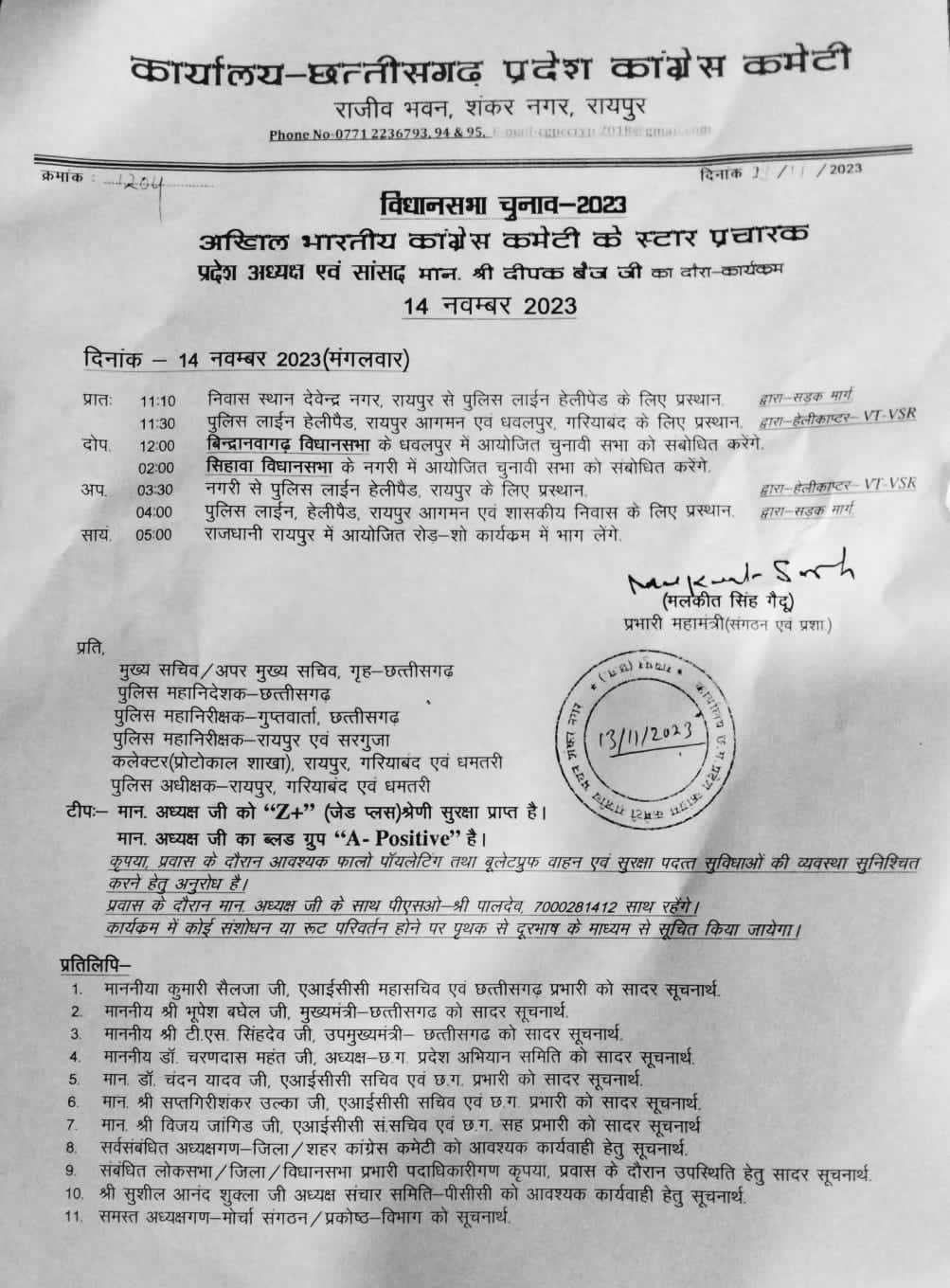 प्रदेश कांग्रेस कमेटी के प्रभारी महामंत्री मलकीत सिंह गैदू ने जानकारी दी है कि पीसीसी चीफ दीपक बैज 14 नवंबर को देवेंद्र नगर रायपुर स्थित निवास से सुबह 11.10 बजे पुलिस लाईन हेलीपेड रवाना होंगे। वे 11.30 बजे हेलीकाप्टर द्वारा रवाना होकर दोपहर 12 बजे बिंद्रा नवागढ़ पहुंचेंगे और चुनावी सभा को संबोधित करेंगे। श्री बैज दोपहर 2 बजे धमतरी जिले के सिहावा विधानसभा क्षेत्र अंतर्गत नगरी पहुंचेंगे। वहां वे चुनावी सभा को संबोधित कर कांग्रेस प्रत्याशी के पक्ष में मतदान की अपील करेंगे। प्रदेश कांग्रेस प्रमुख दीपक बैज नगरी से अपरान्ह 3.30 बजे पुलिस लाईन हेलीपेड रायपुर पहुंचेंगे और देवेंद्र नगर निवास जाएंगे। श्री बैज शाम 5 बजे रायपुर में आयोजित कांग्रेस की राष्ट्रीय महासचिव प्रियंका गांधी के रोड शो में शामिल होंगे।