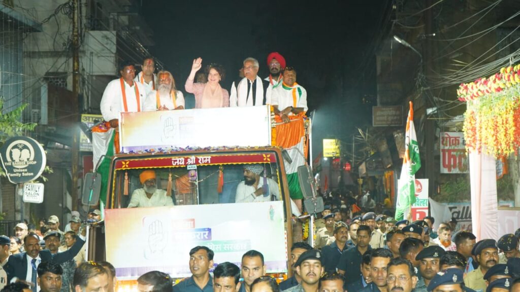 रायपुर :- राजधानी रायपुर में कांग्रेस की राष्ट्रीय महासचिव प्रियंका गांधी ने 14 नवंबर को रोड शो किया। रोड शो में मुख्यमंत्री भूपेश बघेल और प्रदेश कांग्रेस अध्यक्ष दीपक बैज समेत अन्य वरिष्ठ नेता भी शामिल हुए।