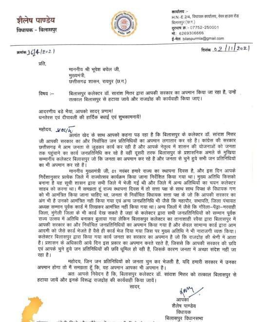 विधायक शैलेश पांडेय ने सीएम को लिखा पत्र,कलेक्टर पर राजद्रोह लगाने की माग की