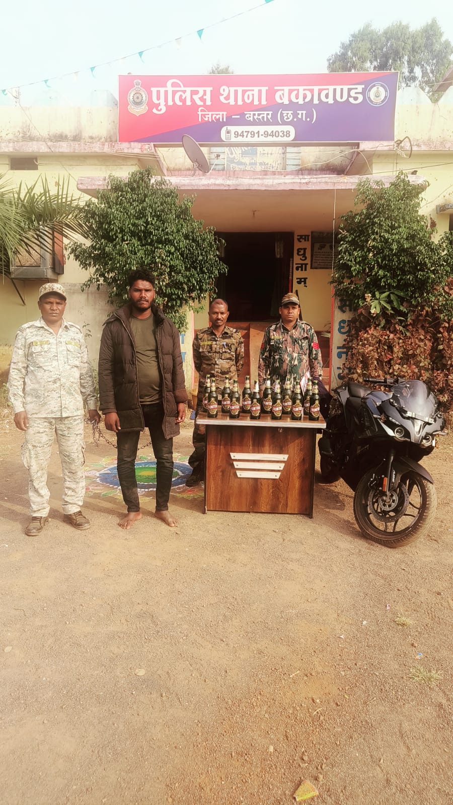 एसएसपी एवं एएसपी के दिशा निर्देश पर अनुविभागीय पुलिस अधिकारी भानपुरी घनश्याम कामड़े के सुपरविजन में 24 नवंबर को ओडिसा से एक बिना नंबर की पल्सर मोटर सायकल में अवैधअंग्रेजी शराब को छुपाकर छत्तीसगढ़ में खपाने के लिए ला रहे युवक को बकावंड थाना प्रभारी निरीक्षक दिनेश कुमार यादव ने अपनी टीम के साथ नलपावंड नाका पर नाकाबंदी कर पकड़ा। जब संदिग्ध बाईक को रूकवाने का प्रयास किया गया तो चालक ने गाड़ी सहित भागने का प्रयास किया। पुलिस के जवानों ने उसे दौड़ाकर पकड़ लिया।संदिग्ध व्यक्ति ने पूछताछ करने पर अपना नाम बलिराम कश्यप पिता कुमोराम कश्यप उम्र 30 वर्ष, निवासी किंजोली थाना बकावंड बताया। तलाशी लेने पर उसके कब्जे से ओड़िशा निर्मित हंटर बियर की 12 बोतलों की पेटी बरामद की गई। बियर की कीमत रुपया 1800 रु बताई गई है। इसके अलावा नगद रकम 3050 रुपए भी उसके पास से मिली। बियर, रकम और मोटर सायकल को जप्त कर आरोपी को गिरफ्तार कर लिया गया। आरोपी को न्यायालय भेजकर न्यायिक रिमांड पर जेल दाखिल किया गया। आरोपी को पकड़ने में निरीक्षक दिनेश कुमार यादव, प्रधान आरक्षक मोहन कश्यप, नीलाधर बघेल, आरक्षक बलिराम भारती, भोलाराम बघेल, जगतराम कश्यप, राहुल नेताम की भूमिका सराहनीय रही।