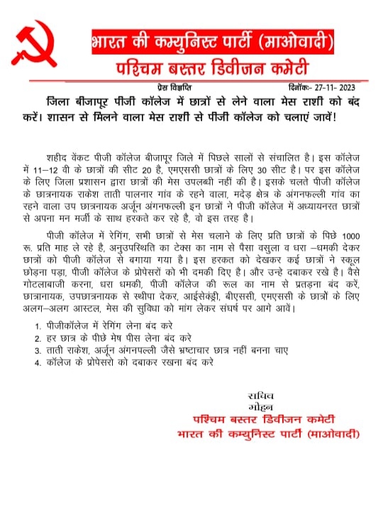 नक्सली संगठन अब तक शासन, प्रशासन, पुलिस, सुरक्षा बलों, ठेकेदारों, निजी माल वाहक गाड़ियों, यात्री बसों, रेलवे लाईनों, निर्माण एजेंसियों आदि को ही टारगेट करते रहे हैं। वनवासियों और आदिवासियों के अधिकारों और जल, जंगल, जमीन की तथाकथित रक्षा की बात करते रहे हैं। इन सबकी आड़ लेकर वे सैकड़ों दफे खून की होली खेल चुके और अरबों खरबों की संपत्ति को नुकसान पहुंचा चुके हैं। छत्तीसगढ़ में इस तरह की घटनाएं अब नई बात नहीं रह गई हैं। यहां के लोग इन सबके अभ्यस्त भी हो चुके हैं। मगर इस सोमवार को नक्सलियों ने एक नया और अप्रत्याशित फरमान जारी कर दिया, जो बस्तर संभाग के साथ ही समूचे छत्तीसगढ़ और देश में भी खलबली मचाने वाला है। दरअसल यह मामला बस्तर संभाग के जिला मुख्यालय बीजापुर केएक कॉलेज से जुड़ा हुआ है। बीजापुर में संचालित शहीद वेंकट शासकीय स्नात्तकोत्तर महाविद्यालय बीजापुर से जुड़े कुछ तथाकथित मसलों को लेकर माओवादी संगठन भारत की काम्युनिस्ट पार्टी (माओवादी) की पश्चिम बस्तर डिवीजन कमेटी के सचिव मोहन ने संगठन के लेटरहेड में कंप्यूटर से प्रिंटेड पत्र जारी किया है। इस पत्र में लिखा है कि बीजापुर महाविद्यालय में छात्रों से ली जाने वाली मेस राशि की वसूली बंद कर शासन से मिलने वाली राशि मेस राशि से पीजी कालेज का मेस चलाया जाए, कॉलेज के रूल्स के नाम पर छात्र छात्राओं को प्रताड़ित करना, घोटालेबाजी करना बंद किया जाए। कहने को तो यह नक्सली संगठन की प्रेस विज्ञप्ति है, लेकिन उसमें जिस भाषा का इस्तेमाल किया गया है, उसे देखते हुए यह एक कड़ा फरमान लगता है। कथित विज्ञप्ति में कहा गया है कि शहीद वेंकट पीजी कालेज बीजापुर जिले में पिछले कई सालों से संचालित है। इस कालेज के हास्टल में हायर सेकंडरी स्कूल की 11वीं व 12वीं के छात्रों की सीट 20 है, एमएससी छात्रों के लिए 30 सीट स्वीकृत है। इस कालेज के लिए जिला प्रशासन द्वारा छात्रों के लिए मेस की सुविधा उपलब्ध नहीं कराई गई है। इसके चलते कॉलेज के छात्र नायक राकेश ताती पालनार गांव व मद्देड़ क्षेत्र के अंगनपल्ली गांव के रहने वाले उप छात्र नायक अर्जुन अंगनपल्ली पीजी कॉलेज में अध्ययनरत छात्र- छात्राओं पर अपनी मर्जी थोपते हुए बेजा हरकतें कर रहे हैं। इस कॉलेज में रेगिंग की जाती है, मेस चलाने हर छात्र से 1000 रू. की वसूली प्रतिमाह की जा रही है, अनुपस्थिति टैक्स के नाम से पैसा वसूला जा रहा है और व डरा – धमकाकर छात्रों को पीजी कॉलेज से भगाया जा रहा है। इस हरकत से परेशान होकर कई छात्रों को स्कूल कॉलेज छोड़ना पड़ा है। पीजी कॉलेज के प्रोफेसरों को भी धमकी दी जाती है और उन्हें दबाकर रखा जाता है। घोटालेबाजी करना, डराना धमकाना, पीजी कालेज के रूल के नाम से प्रताड़ना बंद किया जाए, छात्रा नायक और उप छ