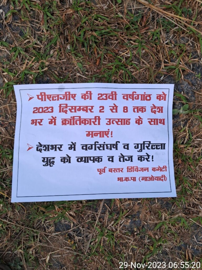 नक्सली मौके पर पर्चा भी चस्पा कर गए हैं।नक्सली संगठन भाकपा (माओवादी) की पूर्व बस्तर डिवीजन कमेटी द्वारा चस्पा किए गए इस पर्चे में पीएलजीए की 23वीं वर्षगांठ को 2 से 8 दिसंबर तक उत्साह के साथ मनाने, देशभर में वर्ग संघर्ष व गुरिल्ला युद्ध को व्यापक एवं तेज करने का आह्वान किया गया है। चुनाव के दौरान बैक फुट पर रहे नक्सली अब फिर से फ्रंट फुट पर आ गए हैं। वे लगातार बड़ी वरदातों को अंजाम देते हुए सुरक्षा बलों को खुली चुनौती दे रहे हैं। प्राइवेट और सरकारी सम्पत्तियों को नुकसान पहुंचा रहे हैं। बीते रविवार और सोमवार की दरम्यानी रात नक्सलियों ने दंतेवाड़ा जिले के भांसी में जमकर उत्पात मचाते हुए आगजनी की थी। भांसी के बीच गांव में नक्सलियों ने सड़क निर्माण एवं रेलवे लाईन के दोहरीकरण कार्य में लगे चौदह वाहनों, मशीनों तथा अन्य उपकरणों को फूंक डाला था। नक्सलियों ने यहां की गई आगजनी की प्रेस नोट जारी कर जवाबदारी लेते हुए बैलाडीला से दंतेवाड़ा के बीच बन रही सड़क का नक्सलियों ने विरोध किया है,अब एकबार फिर एक निजी मोबाईल फोन कंपनी के टॉवर में आगजनी कर दी है जिससे बड़ी आबादी को नेटवर्क की समस्या से जूझना पड़ेगा। नारायणपुर जिला पुलिस मामले की पड़ताल कर रही है और सर्चिंग में लगी हुई है।