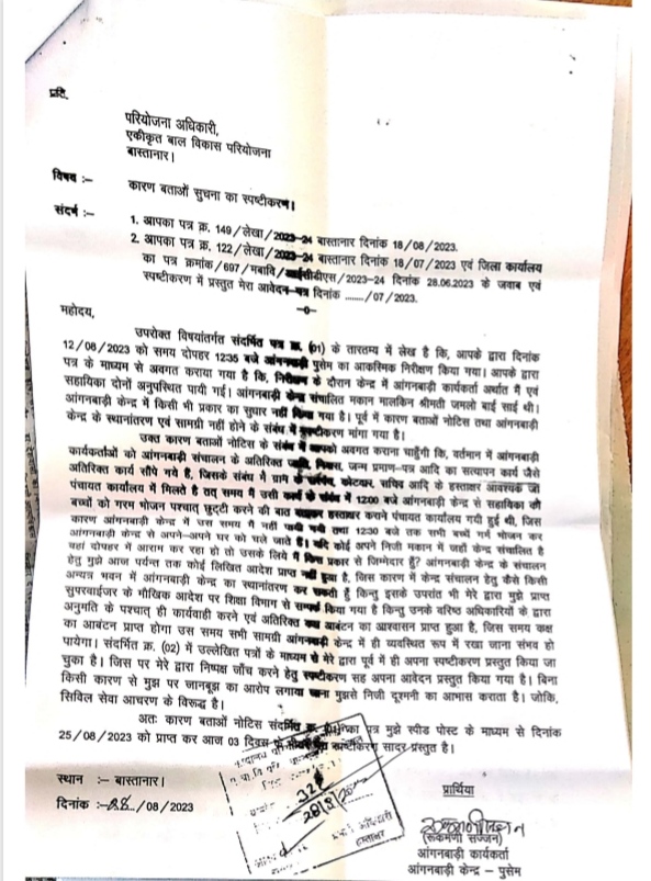 जगदलपुर(अर्जुन झा ):- बास्तानार विकासखंड में पदस्थ महिला एवं बाल विकास विभाग की परियोजना अधिकारी के रवैए का विरोध करने पर ग्राम पुसेम की आंगनबाड़ी कार्यकर्ता की नौकरी साजिश के तहत छीन ली गई। इस मामले में जनपद सदस्यों को भी अंधेरे में रख सेवा समाप्ति के प्रस्ताव को उनसे स्वीकृति दिला दी गई। जिन सरपंच, पंचों व ग्रामीणों की शिकायत का हवाला देकर आंगनबाड़ी कार्यकर्ता को बर्खास्त किया गया है, उन सभी ने शपथ पत्र देकर शिकायत की बात से इंकार किया है।