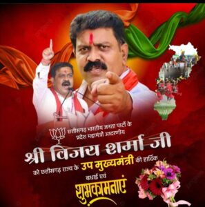 कवर्धा :- राजधानी रायपुर के साइंस कालेज मैदान में बुधवार को कवर्धा से विधायक विजय शर्मा उपमुख्यमंत्री पद की शपथ ली। राज्यपाल विश्वभूषण हरिचंदन ने उन्हें पद और गोपनीयता की शपथ दिलाई। इस दौरान प्रधानमंत्री नरेन्द्र मोदी, केंद्रीय गृहमंत्री अमित शाह सहित कई राज्यों के मुख्यमंत्री समेत दिग्गज नेता कार्यक्रम में उपस्थित रहे।