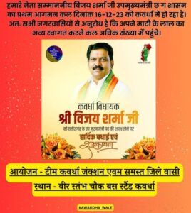 उपमुख्यमंत्री विजय शर्मा कल आयेंगे अपने गृह नगर कवर्धा ,ठाकुर देव चौक से निकलेगी स्वागत यात्रा ,लेंगे जनता का आशीर्वाद