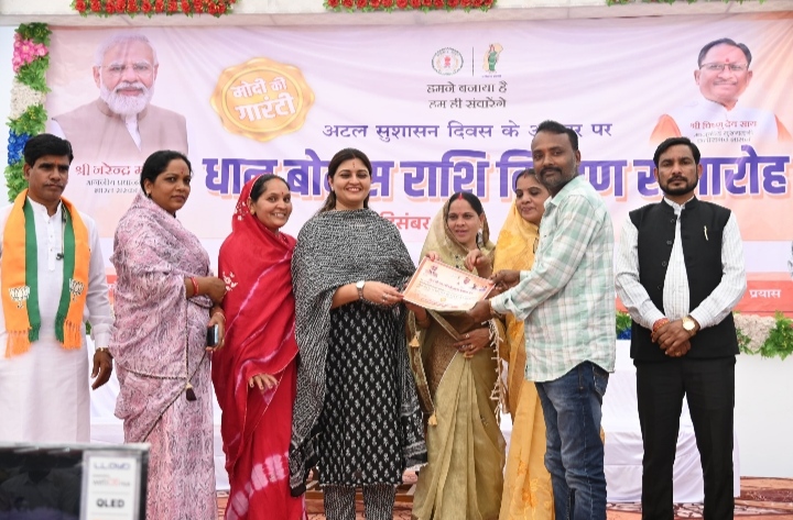 कवर्धा :- मुख्यमंत्री विष्णु देव साय ने अटल बिहारी वाजपेयी की जयंती और सुशासन दिवस के अवसर पर प्रदेश के 12 लाख किसानों के खाते में 3716 करोड़ रुपये दो वर्ष का बकाया धान बोनस ट्रांसफर किया, इसी के साथ भाजपा ने अपने घोषणा पत्र में किये अपने एक प्रमुख वादे को पूरा किया। इसी कड़ी में आज पंडरिया में आयोजित सुशासन दिवस कार्यक्रम में विधायक भावना बोहरा ने भी लाभान्वित किसानों को प्रशस्ति पत्र भेंट किया और उन्हें बधाई दी।
