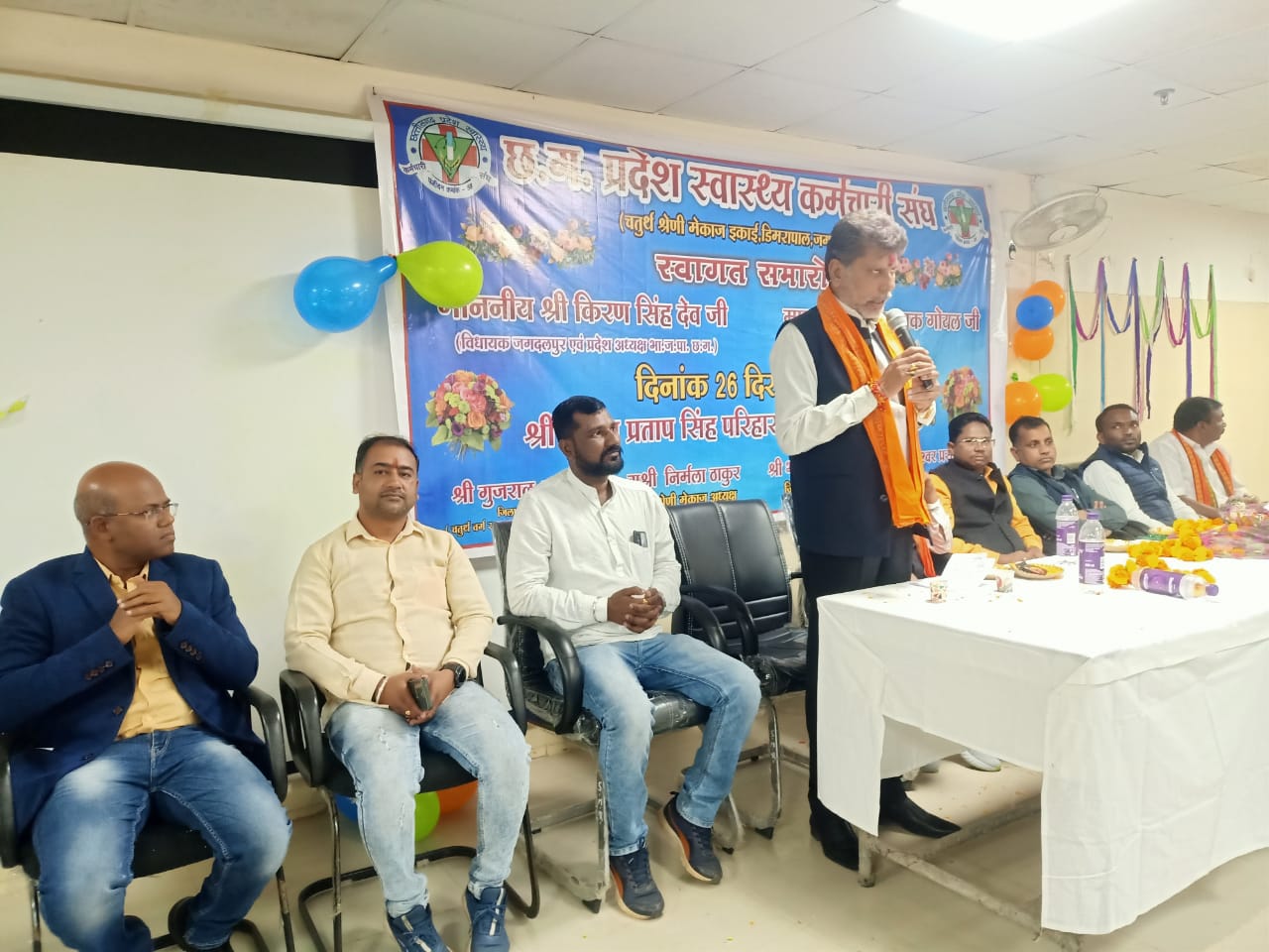 विशाल हॉल में आयोजित अभिनंदन समारोह में जिलेभर के स्वास्थ्य कर्मचारी उपस्थित थे। छत्तीसगढ़ स्वास्थ्य कर्मचारी संघ के उप प्रांताध्यक्ष एवं बस्तर जिला अध्यक्ष अजय प्रताप सिंह परिहार, जिला मीडिया प्रभारी भीखम साहू, चतुर्थ वर्ग स्वास्थ्य कर्मचारी संघ मेकाज के जिला अध्यक्ष गुजराल शार्दुल, चतुर्थ श्रेणी मेकाज अध्यक्ष निर्मला ठाकुर, अनियमित कर्मचारी संघ के जिलाध्यक्ष रिकेश्वर प्रसाद निवेंद्र तथा अन्य पदाधिकारियों ने श्री देव एवं श्री गोयल का विशाल पुष्पाहार पहनाकर, बुके एवं स्मृति चिन्ह भेंटकर अभिनंदन किया।