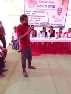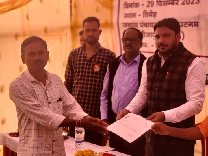 भोपालपटनम :- केन्द्र सरकार की योजनाओं को जन-जन तक पहुंचाने व लाभान्वित हितग्राहियों से संवाद करने के उद्देश्य से चलाए जा रहे अभियान ‘‘विकसित भारत संकल्प यात्रा‘‘ का आयोजन ग्राम पंचायत तिमेड़ जनपद पंचायत भोपालपटनम में आयोजित कार्यक्रम में वित्तीय वर्ष 2022-23 में स्वीकृत हितग्राहियों को स्वीकृति पत्र वितरण किया गया। हितग्राहियों ने स्वीकृति पत्र मिलने के पश्चात खुशी जाहिए की और केन्द्र सरकार की योजनाओं की तारीफ करते हुए कहा कि यह योजना गरीब परिवारों के लिए एक वरदान है।