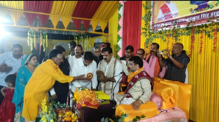 कवर्धा :- 31 दिसंबर,छत्तीसगढ़ के उपमुख्यमंत्री एवं कवर्धा विधायक श्री विजय शर्मा कवर्धा के नंदी विहार कालोनी में आयोजित भागवत कथा में शामिल हुए। उपमुख्यमंत्री श्री शर्मा क्षेत्र की जनता के साथ बैठकर श्रीमद भागवत कथा श्रवण किया। उन्होंने श्रीमद भागवत पुराण पर पुष्प अर्पित करते हुए प्रदेश तथा क्षेत्र की जनता की खुशहाली की कामना की। भागवत कथा श्री प्रहलाद सिंह ठाकुर, श्रीमती ममता सिंह ठाकुर, श्री सौरभ सिंह परिहार द्वारा आयोजित किया गया था। इस अवसर पर पूर्व संसदीय सचिव श्री मोतिराम चंद्रवंशी, पूर्व विधायक श्री अशोक साहू, जिला पंचायत सदस्य श्री रामकुमार भट्ट, श्री गणेश तिवारी, श्री कैलाश चंद्रवंशी, श्री चंद्रप्रकाश चंद्रवंशी, श्री श्रीकांत उपाध्याय, श्री उमंग पाण्डेय, श्री अजय सिंह ठाकुर, श्री राजकुमार वर्मा सहित जनप्रतिनिधि, पतंजली योगपीठ के सदस्य उपस्थित थे।