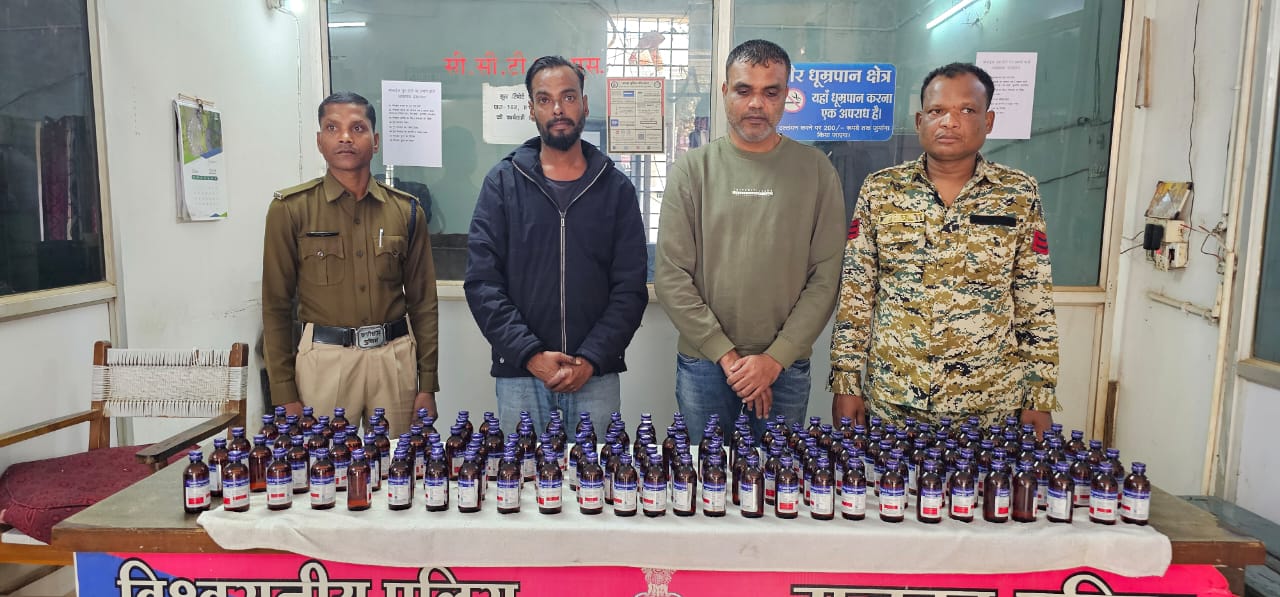 सिटी कोतवाली पुलिस को सूचना मिली थी कि ग्राम हाटगुड़ा में एक व्यक्ति अवैध दवाई सिरप तथा आमागुड़ा चौक के पास मेन रोड पर एक लाल रंग की क्रेटा कार में सवार दो व्यक्ति अवैध रूप से नशीली सिरप काफी मात्रा में रखकर बिक्री हेतु तस्करी कर रहे हैं। इसके बाद उप पुलिस महानिरीक्षक एवं वरिष्ठ पुलिस अधीक्षक जितेंद्र सिंह मीणा के मार्गदर्शन तथा अतिरिक्त पुलिस अधीक्षक माहेश्वर नाग एवं नगर पुलिस अधीक्षक विकास कुमार के पर्यवेक्षण और थाना प्रभारी कोतवाली लीलाधर राठौर के नेतृत्व में अलग अलग टीमें रवाना की गईं। इन टीमों ने घेराबंदी कर तीन संदिग्ध व्यक्तियों को पकड़ा। उन्होंने अपना नाम अमन बघेल, अभिषेक जैन तथा सचिन उपाध्याय बताया। अमन बघेल के बैग की तलाशी लेने पर 50 नग क्लोरो फेनिरमाइन मेलिट और कोडिन फास्फेट सिरप कीमती 4350 रूपए तथा अभिषेक जैन व सचिन उपाध्याय की कार की डिक्की में रखे बैग से तलाशी लेने पर 150 नग कोडिन फास्फेट एंड ट्रिप्रो लाइडिन हाइड्रो क्लोराइड सिरप कीमती 25 हजार 500 रूपए, दो नग मोबाईल फोन एवं नकद रकम 600 रूपए मिले। आरोपियों के विरूद्ध थाना कोतवाली में धारा 21 एनडीपीएस एक्ट के तहत अपराध पंजीबद्ध कर सभी आरोपियों को न्यायालय रवाना किया गया। जप्तशुदा दवाइयों की अनुमानित कीमत 29 हजार 850 रूपए है। मामले में निरीक्षक लीलाधर राठौर, सुरेश जांगड़े, उप निरीक्षक प्रमोद ठाकुर, सूर्यकांत तिवारी, सहायक उप निरीक्षक भुनेश्वर पाण्डेय, प्रधान आरक्षक अनंत बघेल, उमेश चंदेल, कोमश्वर बघेल, आरक्षक भूपेंद्र नेताम, रवि सरदार, युवराज सिंह, भृगु कश्यप, नकुल नुरेटी, विनोद खेस का योगदान रहा।