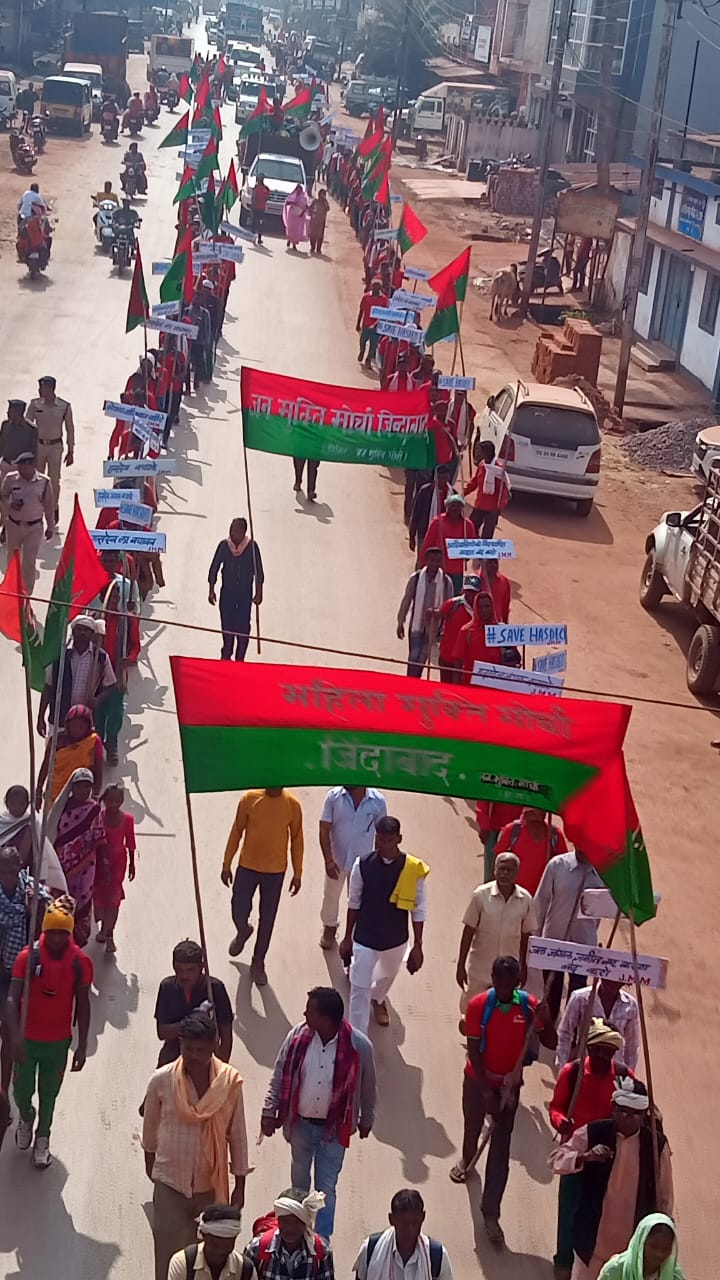 दल्ली राजहरा। हसदेव जंगल की कटाई, जंगली जीव जंतु को बेघर करने और वहां के आदिवासियों को विस्थापित करने के खिलाफ जन मुक्ति मोर्चा द्वारा दल्ली राजहरा से राजधानी रायपुर निकाली जा रही पदयात्रा के दौरान दूसरे दिन भी तनातनी हो गई। रसद ले जाने से रोकने पर पुलिस और मोर्चा कार्यकर्ताओं में जमकर बहस हुई। लगभग 600 लोग पदयात्रा में शामिल हैं और राज्यपाल को ज्ञापन सौपने रायपुर कूच कर रहे हैं।जिला प्रशासन बालोद व दल्ली राजहरा प्रशासन द्वारा जन मुक्ति मोर्चा को राशन सामान नहीं ले जाने दे रहे थे। मोर्चा के लोग राशन साथ ले जाने की जिद पर अड़े रहे। वे इसका कारण पूछते हुए अपनी गिरफ्तारी देने पर अड़ गए। अरमुरकसा के पास पुलिस प्रशासन द्वारा रैली को एकबार फिर बल पूर्वक रोकने का प्रयास किया गया, लेकिन जन मुक्ति मोर्चा के हौसले के आगे प्रशासन की एक नही चली और पदयात्रा आगे बढ़ती रही। कुसुमकसा में आदिवासी नेता रत्तीराम कोसमा पदयात्रा का हिस्सा बने। कुसुमकसा के आगे करियाटोला के पुल के पास पुलिस ने बेरिकेट लगाकर रोड को बंद कर दिया था और आम जनता को भी आने जाने नही दिया जा रहा था। प्रशासन यह कहता रहा कि आप को आगे जाने की अनुमति हम नही दे सकते। जबकि मोर्चा ने 8 जनवरी को बालोद जिला कलेक्टर को और 12 जनवरी को जिला कलेक्टर दुर्ग व जिला कलेक्टर रायपुर को अनुमति हेतु आवेदन पत्र दिया था, जिसकी पावती भी है। फिर भी प्रशासन द्वारा पदयात्रा को रोकने की कोशिश की जाने लगी। जन मुक्ति मोर्चा के लोगों और पुलिस प्रशासन के बीच नोकझोंक हुई और कार्यकर्ता आगे बढ़ने का प्रयास करने लगे। लेकिन पुलिसकर्मियों ने उन्हें आगे बढ़ने नहीं दिया। इससे गुस्साए जन मुक्ति मोर्चा के लोग वहीं धरने पर बैठ गए।लगभग एक घंटे बाद मोर्चा के प्रतिनिधियों ने धरना स्थगित किया।