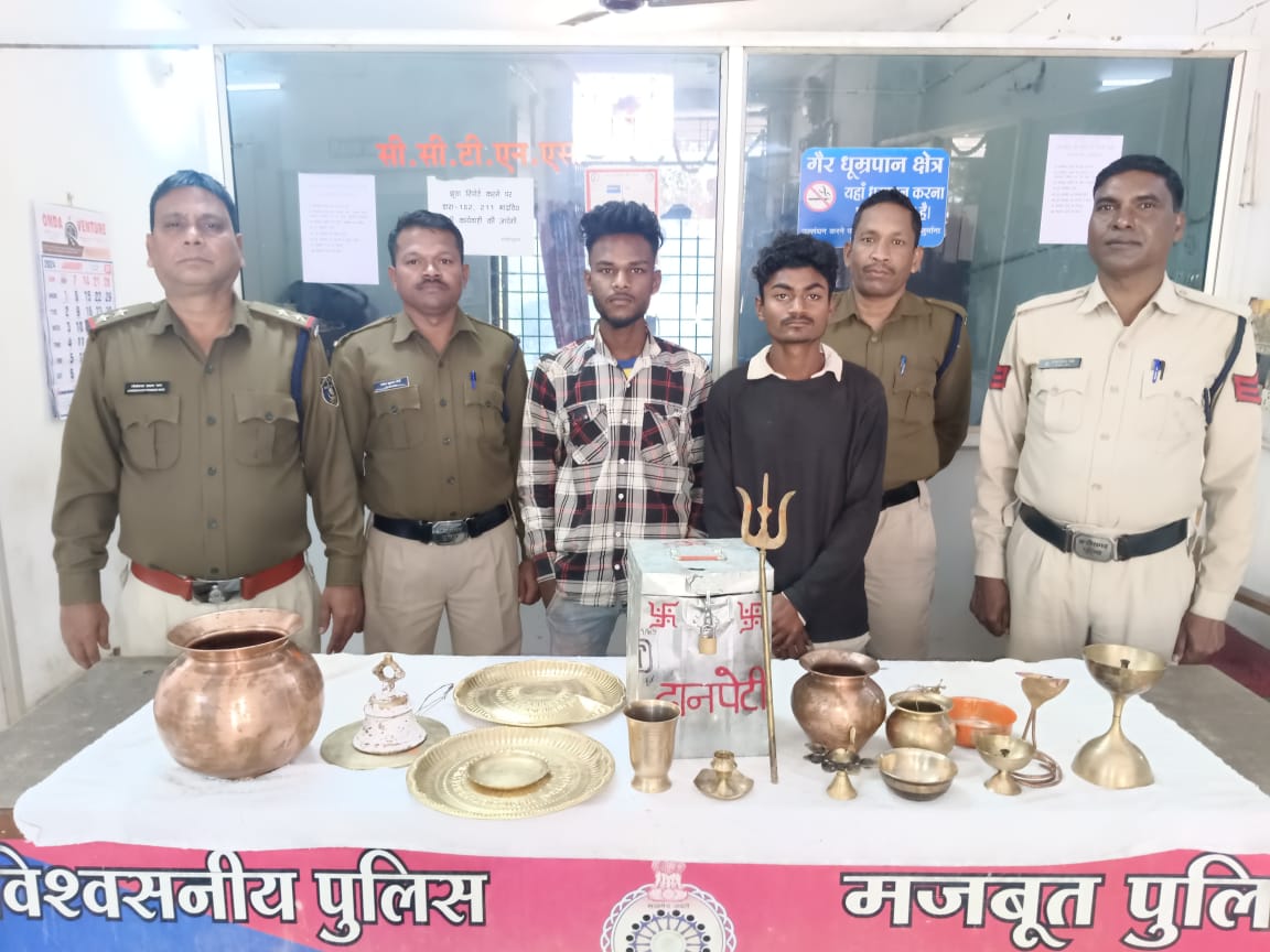 जगदलपुर। मंदिर का ताला तोडकर पूजा सामग्री, त्रिशूल, घंटी,कलश, बर्तन, दानपेटी, व नकद रकम चोरी करने वाले तीन आरोपियों को कोतवाली पुलिस ने 24 घंटे के भीतर धर दबोचा। आरोपियों से सारी सामग्री 3 सौ रू. नकदी रकम बरामद कर ली गई है।